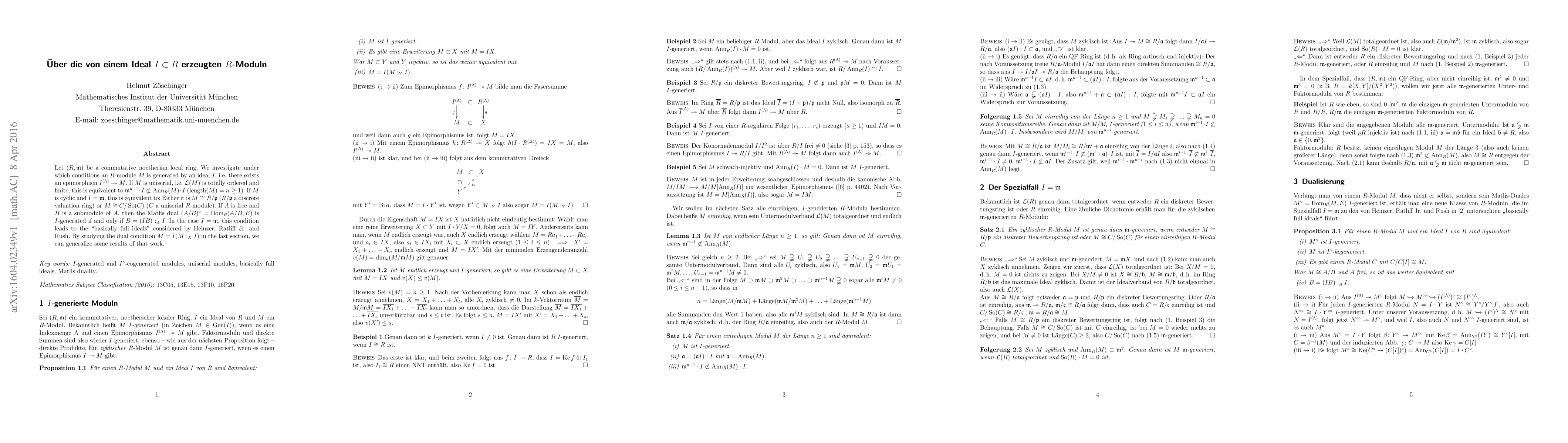 Let $(R, \mathfrak m)$ be a commutative noetherian local ring. We investigate under which conditions an $R$-module $M$ is generated by an ideal $I$, i.e. there exists an epimorphism $I^{(\Lambda)} \twoheadrightarrow M$. If $M$ is uniserial, i.e. $\mathcal{L}(M)$ is totally ordered and finite, this is equivalent to $\mathfrak{m}^{n-1} \cdot I \not\subset \operatorname{Ann}_R(M) \cdot I$ ($\operatorname{length}(M) = n \geq 1$). If $M$ is cyclic and $I = \mathfrak{m}$, this is equivalent to: Either it is $M \cong R/\mathfrak{p}$ ($R/\mathfrak{p}$ a discrete valuation ring) or $M \cong C/\operatorname{So}(C)$ ($C$ a uniserial $R$-module). If $A$ is free and $B$ is a submodule of $A$, then the Matlis dual $(A/B)^{\circ} = operatorname{Hom}_R(A/B, E)$ is $I$-generated if and only if $B = (IB) :_A I$. In the case $I = \mathfrak{m}$, this condition leads to the "basically full ideals" considered by Heinzer, Ratliff~Jr. and Rush. By studying the dual condition $M = I(M :_X I)$ in the last section, we can generalize some results of that work.