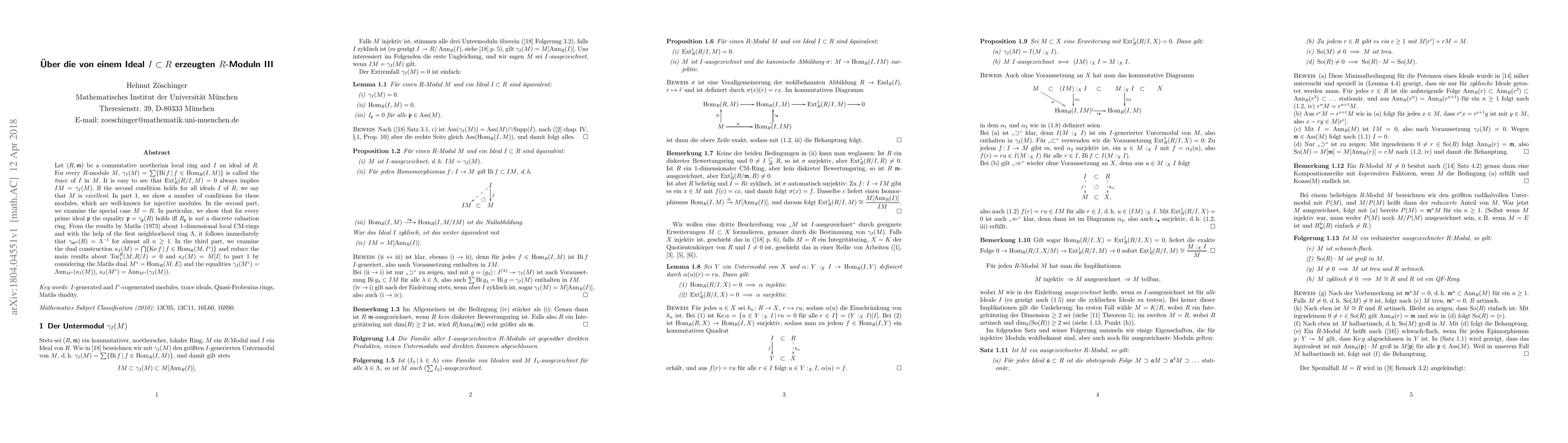 Let $(R, \mathfrak m)$ be a commutative noetherian local ring and $I$ an ideal of $R$. For every $R$-module $M$, $\gamma_I(M) = \sum\{ \operatorname{Bi} f \,|\, f \in \operatorname{Hom}_R(I,M)\}$ is called the trace of $I$ in $M$. It is easy to see that $\operatorname{Ext}_R^1(R/I,M) = 0$ always implies $IM = \gamma_I(M)$. If the second condition holds for all ideals $I$ of $R$, we say that $M$ is excellent. In part 1, we show a number of conditions for these modules, which are well-known for injective modules. In the second part, we examine the special case $M = R$. In particular, we show that for every prime ideal $\mathfrak{p}$ the equality $\mathfrak{p} = \gamma_{\mathfrak{p}}(R)$ holds iff $R_{\mathfrak{p}}$ is not a discrete valuation ring. From the results by Matlis (1973) about 1-dimensional local CM-rings and with the help of the first neighborhood ring $\Lambda$, it follows immediately that $\gamma_{\mathfrak{m}^n} (R) = \Lambda^{-1}$ for almost all $n \geq 1$. In the third part, we examine the dual construction $\kappa_I(M) = \bigcap \{ \operatorname{Ke} f \,|\, f\in \operatorname{Hom}_R(M,I^\circ) \}$ and reduce the main results about $\operatorname{Tor}_1^R(M, R/I) = 0$ and $\kappa_I(M) = M[I]$ to part 1 by considering the Matlis dual $M^\circ = \operatorname{Hom}_R(M, E)$ and the equalities $\gamma_I(M^\circ) = \operatorname{Ann}_{M^\circ}(\kappa_I(M))$, $\kappa_I(M^\circ) = \operatorname{Ann}_{M^\circ}(\gamma_I(M))$.