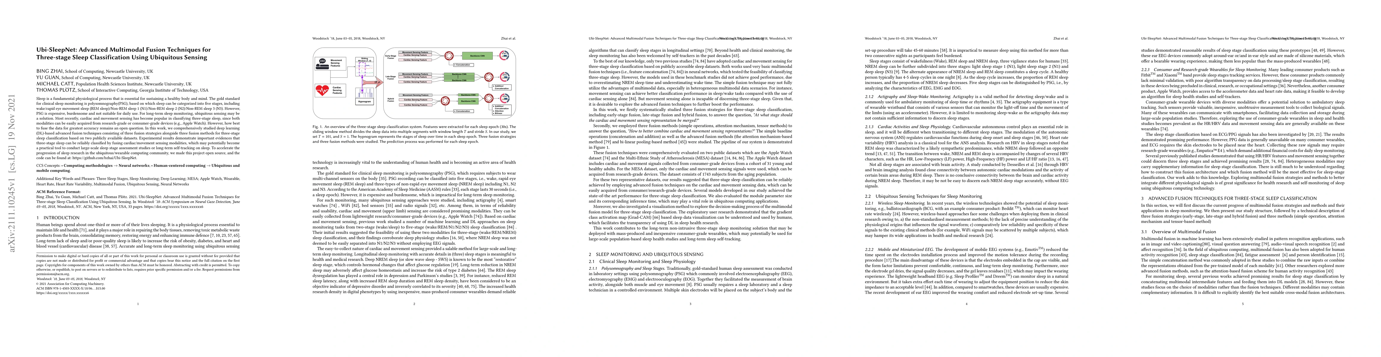 This paper proposes Ubi-SleepNet, a deep learning-based system for three-stage sleep classification using ubiquitous sensing. It explores advanced multimodal fusion techniques to combine cardiac and movement data for accurate sleep stage categorization, demonstrating potential for long-term, non-invasive sleep monitoring.
