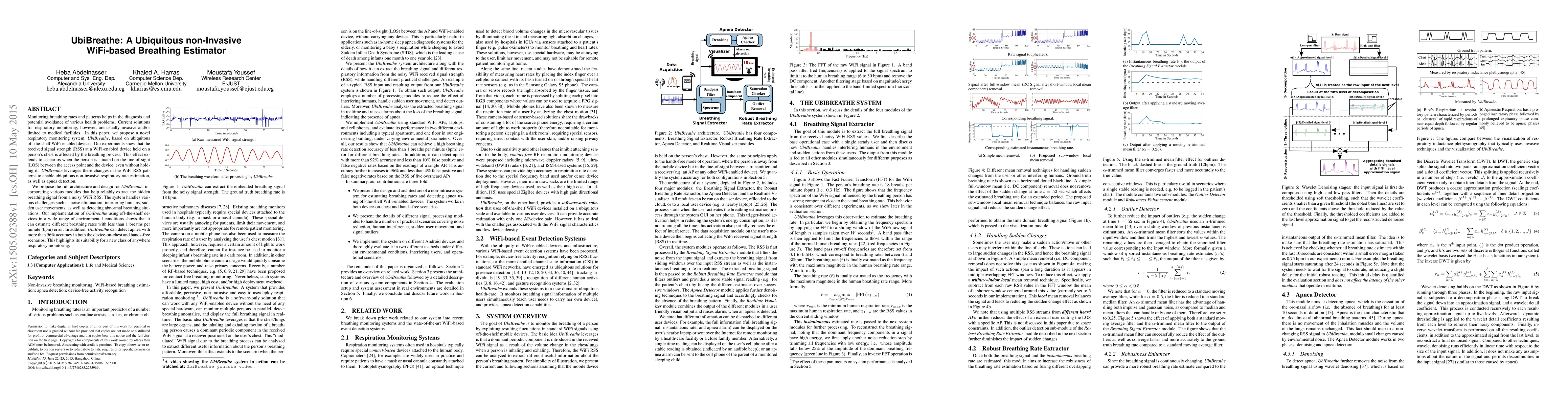 UbiBreathe is a non-invasive, WiFi-based system for estimating breathing rates using off-the-shelf devices, leveraging changes in received signal strength to detect respiratory patterns and apnea with high accuracy. The system addresses challenges like noise and interference, demonstrating reliable performance in various conditions.