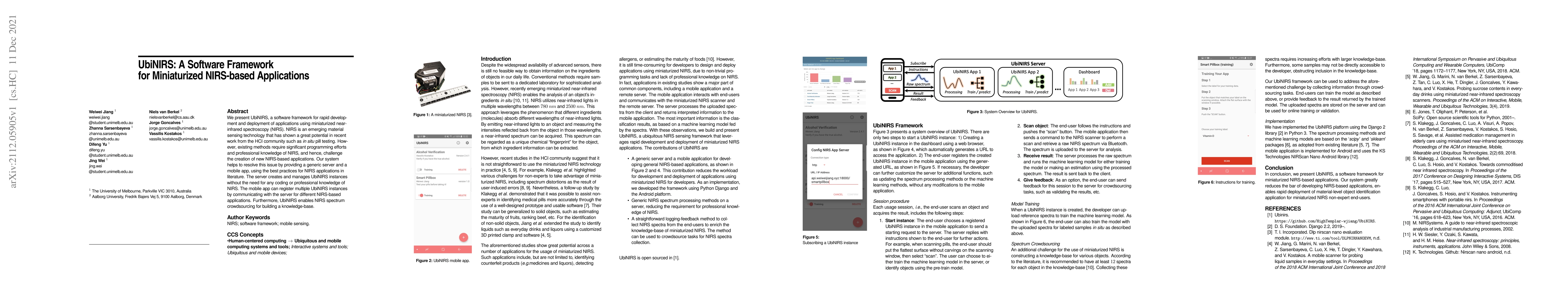 We present UbiNIRS, a software framework for rapid development and deployment of applications using miniaturized near-infrared spectroscopy (NIRS). NIRS is an emerging material sensing technology that has shown a great potential in recent work from the HCI community such as in situ pill testing. However, existing methods require significant programming efforts and professional knowledge of NIRS, and hence, challenge the creation of new NIRS based applications. Our system helps to resolve this issue by providing a generic server and a mobile app, using the best practices for NIRS applications in literature. The server creates and manages UbiNIRS instances without the need for any coding or professional knowledge of NIRS. The mobile app can register multiple UbiNIRS instances by communicating with the server for different NIRS based applications. Furthermore, UbiNIRS enables NIRS spectrum crowdsourcing for building a knowledge base.