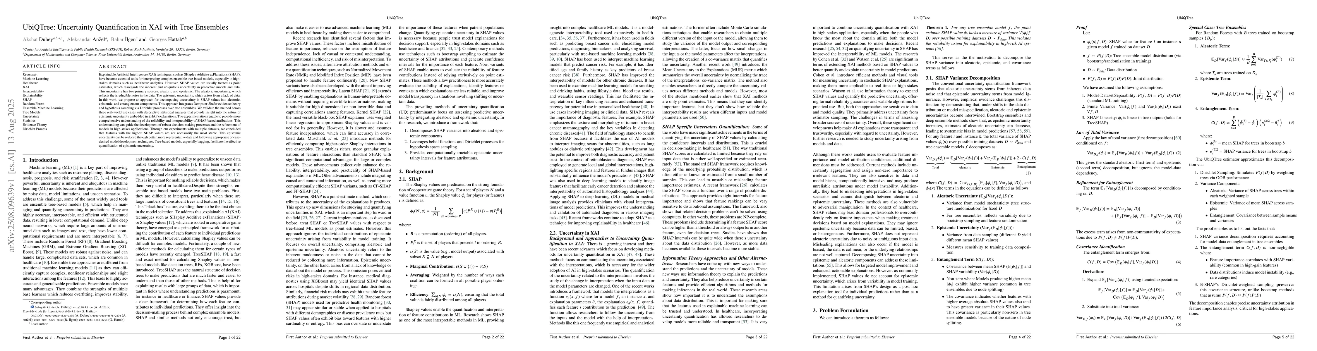 The paper introduces UbiQTree, a method decomposing SHAP values' uncertainty in tree ensembles into aleatoric, epistemic, and entanglement components. Using Dempster-Shafer evidence theory and Dirichlet processes, UbiQTree provides a more comprehensive understanding of SHAP explanation reliability, crucial for high-stakes applications like healthcare. Experiments reveal that top SHAP-ranked features aren't always stable, and this epistemic uncertainty can be minimized with better data and tailored model development techniques, especially benefiting from tree-based models like bagging.