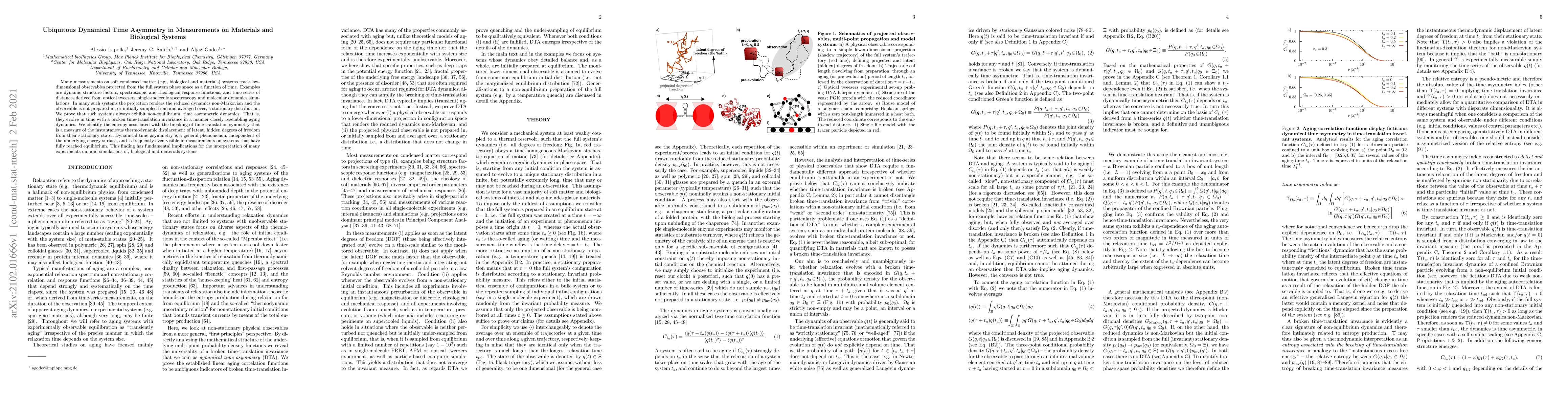 Many measurements on soft condensed matter (e.g., biological and materials) systems track low-dimensional observables projected from the full system phase space as a function of time. Examples are dynamic structure factors, spectroscopic and rheological response functions, and time series of distances derived from optical tweezers, single-molecule spectroscopy and molecular dynamics simulations. In many such systems the projection renders the reduced dynamics non-Markovian and the observable is not prepared in, or initially sampled from and averaged over, a stationary distribution. We prove that such systems always exhibit non-equilibrium, time asymmetric dynamics. That is, they evolve in time with a broken time-translation invariance in a manner closely resembling aging dynamics. We identify the entropy associated with the breaking of time-translation symmetry that is a measure of the instantaneous thermodynamic displacement of latent, hidden degrees of freedom from their stationary state. Dynamical time asymmetry is a general phenomenon, independent of the underlying energy surface, and is frequently even visible in measurements on systems that have fully reached equilibrium. This finding has fundamental implications for the interpretation of many experiments on, and simulations of, biological and materials systems.