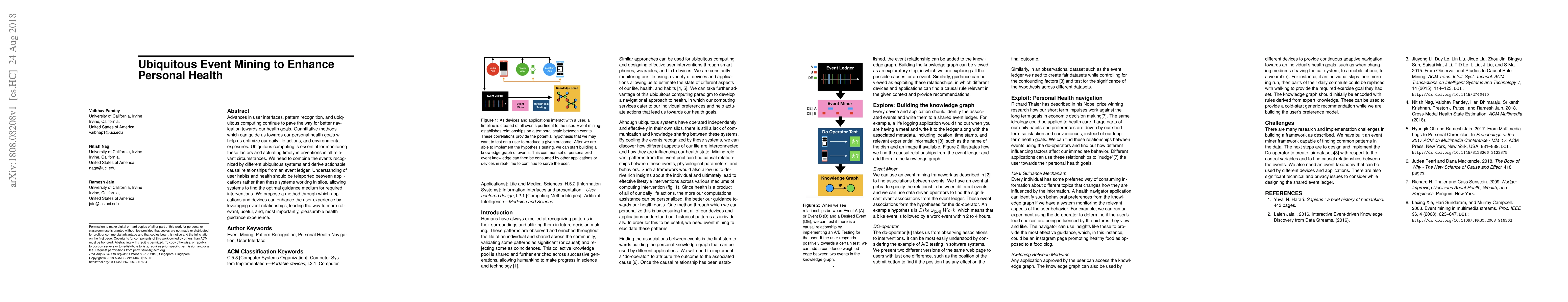 This paper proposes a method for enhancing personal health through ubiquitous event mining, leveraging pattern recognition and ubiquitous computing to monitor daily actions and environmental factors. The goal is to derive actionable causal relationships from event data across different systems, optimizing health guidance for a more relevant and pleasurable user experience.
