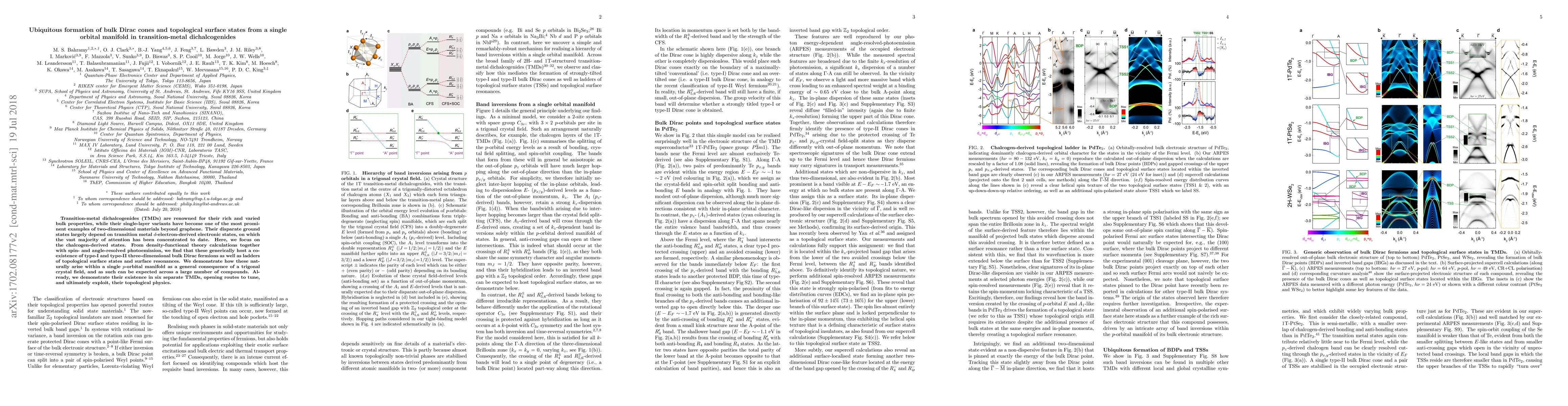 This paper reveals that chalcogen-derived p-orbital states in transition-metal dichalcogenides host type-II three-dimensional bulk Dirac fermions and topological surface states, arising from a trigonal crystal field. The findings suggest these phenomena can be widespread across many TMD compounds, with demonstrated existence in six different materials.
