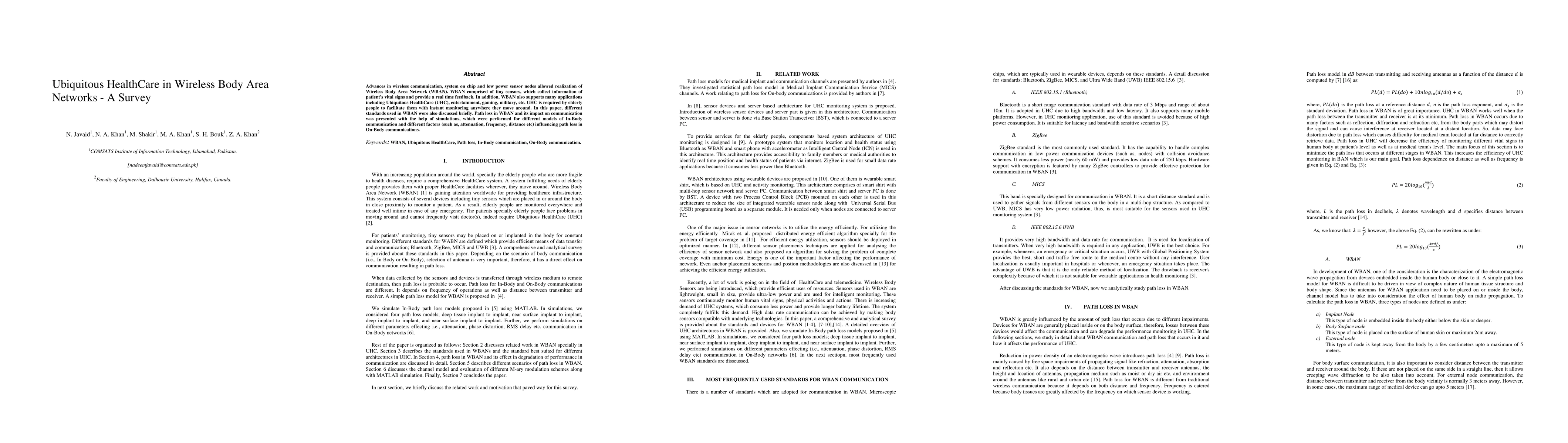 This paper surveys Wireless Body Area Networks (WBAN) and their role in Ubiquitous HealthCare, highlighting the use of low-power sensors for real-time patient monitoring. It also discusses various communication standards, path loss factors, and their impact on WBAN communication, supported by simulation results.