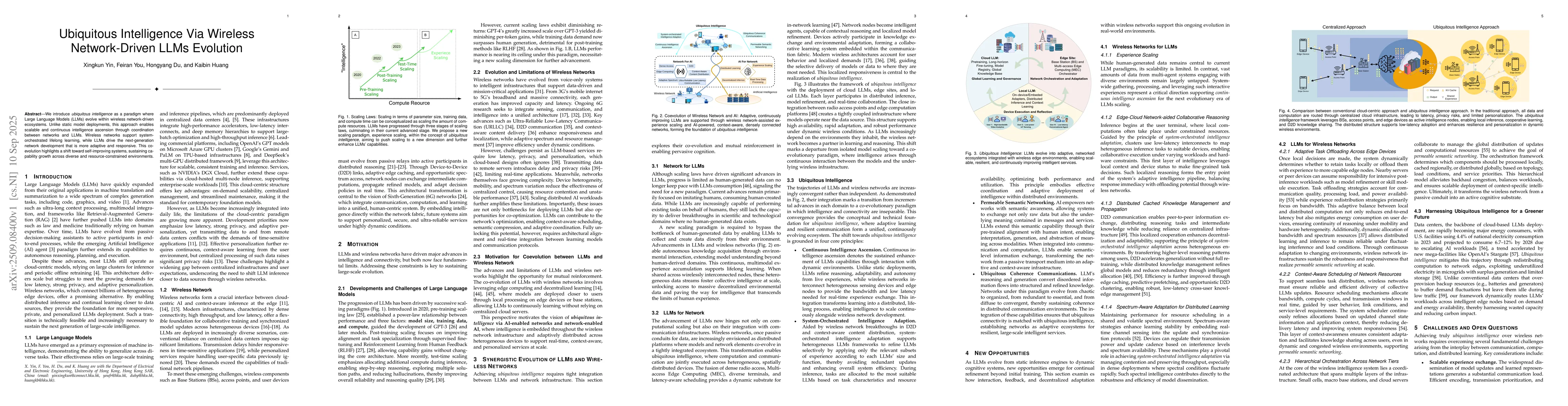 We introduce ubiquitous intelligence as a paradigm where Large Language Models (LLMs) evolve within wireless network-driven ecosystems. Unlike static model deployments, this approach enables scalable and continuous intelligence ascension through coordination between networks and LLMs. Wireless networks support system-orchestrated lifelong learning, while LLMs drive the next-generation network development that is more adaptive and responsive. This co-evolution highlights a shift toward self-improving systems, sustaining capability growth across diverse and resource-constrained environments.