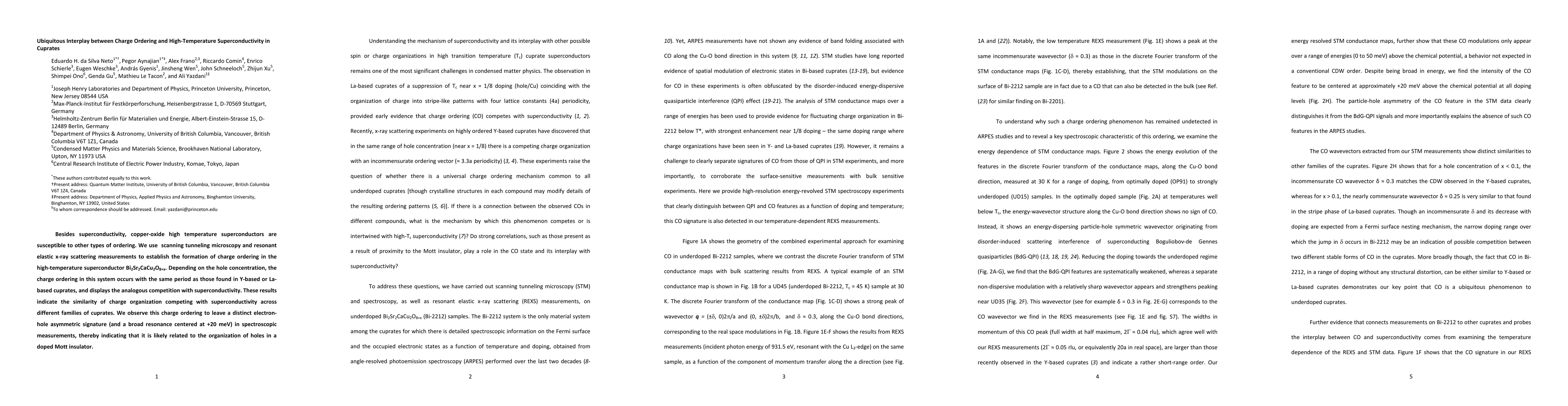 This study reveals the coexistence of charge ordering and high-temperature superconductivity in Bi2Sr2CaCu2O8+x, using scanning tunneling microscopy and resonant elastic x-ray scattering. The findings show a similar competition between charge ordering and superconductivity across different cuprate families, suggesting a universal mechanism for this interplay.
