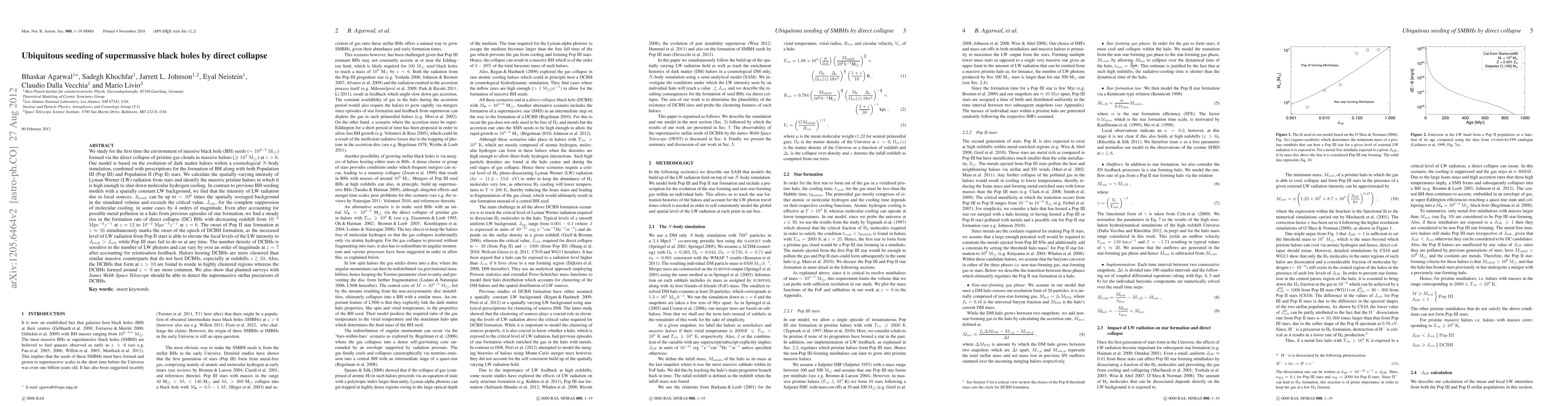 We study for the first time the environment of massive black hole (BH) seeds (~10^4-5 Msun) formed via the direct collapse of pristine gas clouds in massive haloes (>10^7 Msun) at z>6. Our model is based on the evolution of dark matter haloes within a cosmological N-body simulation, combined with prescriptions for the formation of BH along with both Pop III and Pop II stars. We calculate the spatially-varying intensity of Lyman Werner (LW) radiation from stars and identify the massive pristine haloes in which it is high enough to shut down molecular hydrogen cooling. In contrast to previous BH seeding models with a spatially constant LW background, we find that the intensity of LW radiation due to local sources, J_local, can be up to 10^6 times the spatially averaged background in the simulated volume and exceeds the critical value, J_crit, for the complete suppression of molecular cooling, in some cases by 4 orders of magnitude. Even after accounting for possible metal pollution in a halo from previous episodes of star formation, we find a steady rise in the formation rate of direct collapse (DC) BHs with decreasing redshift from 10^{-3}/Mpc^3/z at z=12 to 10^{-2}/Mpc^3/z at z=6. The onset of Pop II star formation at z~16 simultaneously marks the onset of the epoch of DCBH formation, as the increased level of LW radiation from Pop II stars is able to elevate the local levels of the LW intensity to J_local > J_crit while Pop III stars fail to do so at any time. The number density of DCBHs is sensitive to the number of LW photons and can vary by an order of magnitude at z=6 after accounting for reionisation feedback. Haloes hosting DCBHs are more clustered than similar massive counterparts that do not host DCBHs, especially at redshifts z>10. We also show that planned surveys with JWST should be able to detect the supermassive stellar precursors of DCBHs.