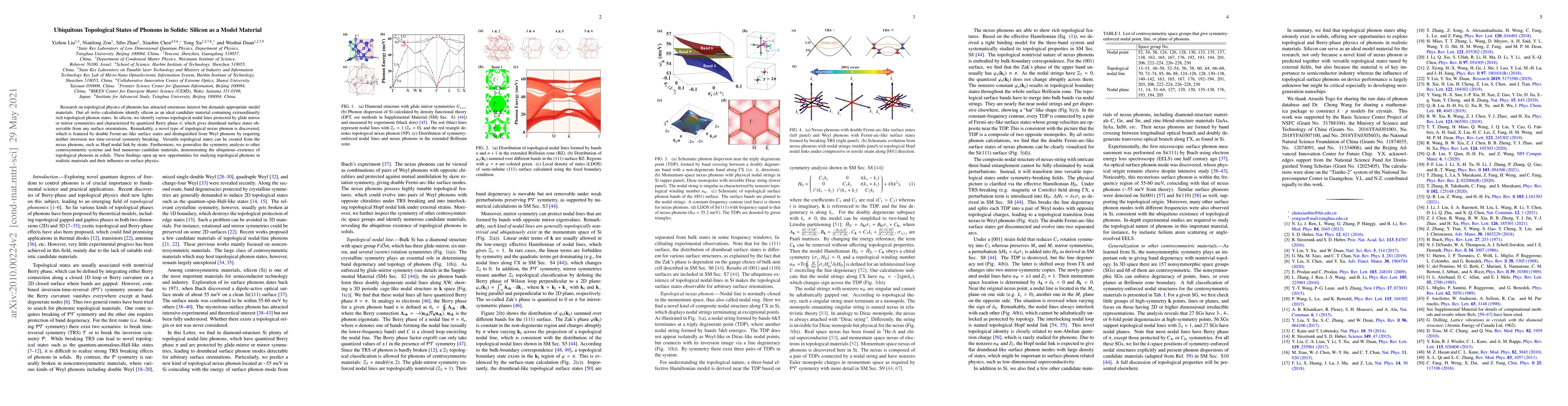 Research on topological physics of phonons has attracted enormous interest but demands appropriate model materials. Our {\it ab initio} calculations identify silicon as an ideal candidate material containing extraordinarily rich topological phonon states. In silicon, we identify various topological nodal lines protected by glide mirror or mirror symmetries and characterized by quantized Berry phase $\pi$, which gives drumhead surface states observable from any surface orientations. Remarkably, a novel type of topological nexus phonon is discovered, which is featured by double Fermi-arc-like surface states and distinguished from Weyl phonons by requiring neither inversion nor time-reversal symmetry breaking. Versatile topological states can be created from the nexus phonons, such as Hopf nodal link by strain. Furthermore, we generalize the symmetry analysis to other centrosymmetric systems and find numerous candidate materials, demonstrating the ubiquitous existence of topological phonons in solids. These findings open up new opportunities for studying topological phonons in realistic materials and their influence on surface physics.