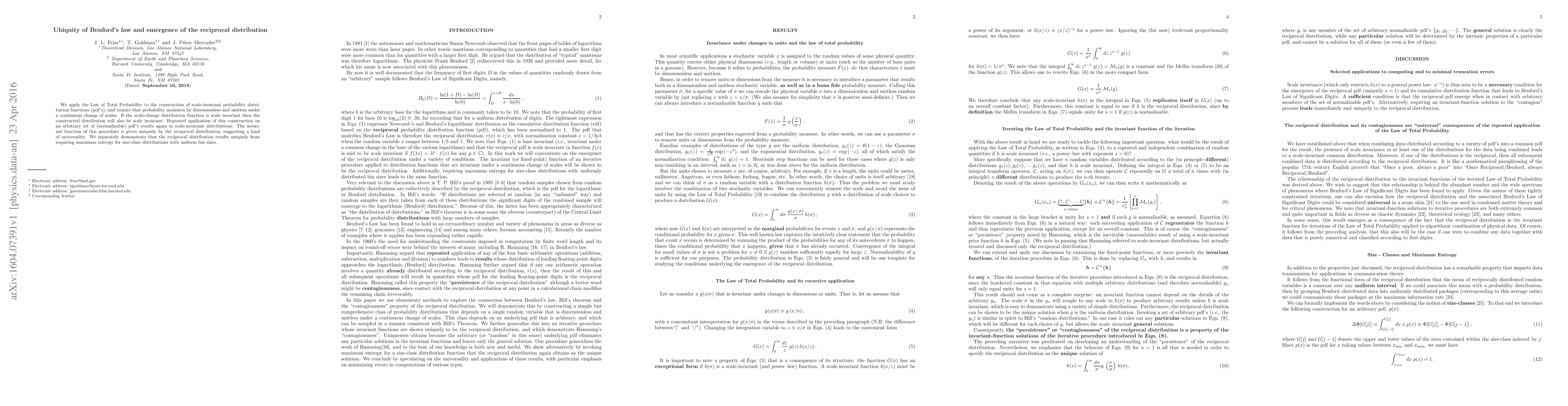 We apply the Law of Total Probability to the construction of scale-invariant probability distribution functions (pdfs), and require that probability measures be dimensionless and unitless under a continuous change of scales. If the scale-change distribution function is scale invariant then the constructed distribution will also be scale invariant. Repeated application of this construction on an arbitrary set of (normalizable) pdfs results again in scale-invariant distributions. The invariant function of this procedure is given uniquely by the reciprocal distribution, suggesting a kind of universality. We separately demonstrate that the reciprocal distribution results uniquely from requiring maximum entropy for size-class distributions with uniform bin sizes.