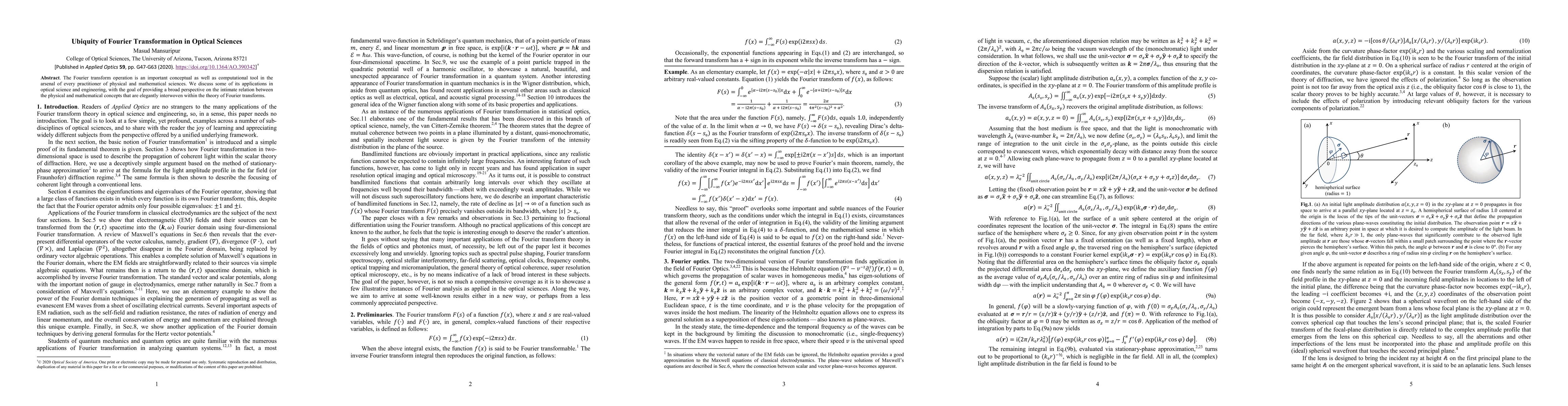 The Fourier transform operation is an important conceptual as well as computational tool in the arsenal of every practitioner of physical and mathematical sciences. We discuss some of its applications in optical science and engineering, with the goal of providing a broad perspective on the intimate relation between the physical and mathematical concepts that are elegantly interwoven within the theory of Fourier transforms.