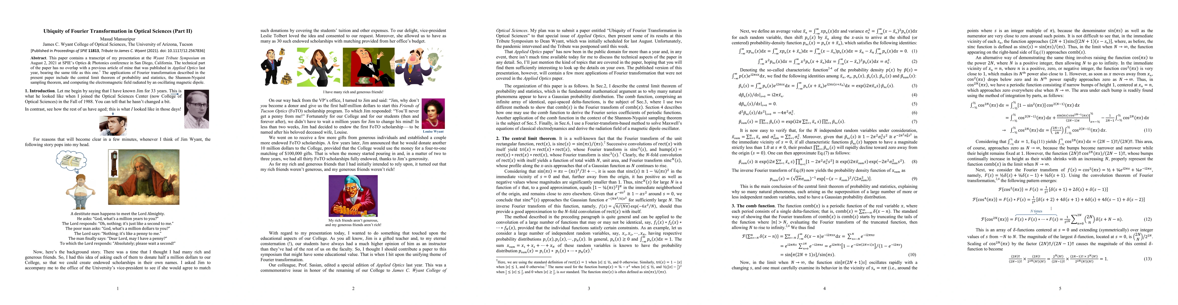 This paper contains a transcript of my presentation at the Wyant Tribute Symposium on August 2, 2021 at SPIE's Optics & Photonics conference in San Diego, California. The technical part of the paper has no overlap with a previous article of mine that was published in Applied Optics last year, bearing the same title as this one.1 The applications of Fourier transformation described in the present paper include the central limit theorem of probability and statistics, the Shannon-Nyquist sampling theorem, and computing the electromagnetic field radiated by an oscillating magnetic dipole.
