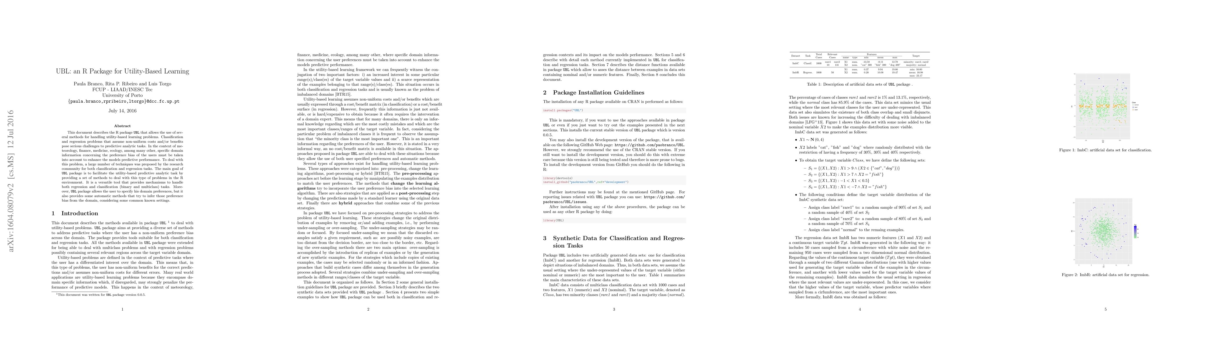 This document describes the R package UBL that allows the use of several methods for handling utility-based learning problems. Classification and regression problems that assume non-uniform costs and/or benefits pose serious challenges to predictive analytic tasks. In the context of meteorology, finance, medicine, ecology, among many other, specific domain information concerning the preference bias of the users must be taken into account to enhance the models predictive performance. To deal with this problem, a large number of techniques was proposed by the research community for both classification and regression tasks. The main goal of UBL package is to facilitate the utility-based predictive analytic task by providing a set of methods to deal with this type of problems in the R environment. It is a versatile tool that provides mechanisms to handle both regression and classification (binary and multiclass) tasks. Moreover, UBL package allows the user to specify his domain preferences, but it also provides some automatic methods that try to infer those preference bias from the domain, considering some common known settings.