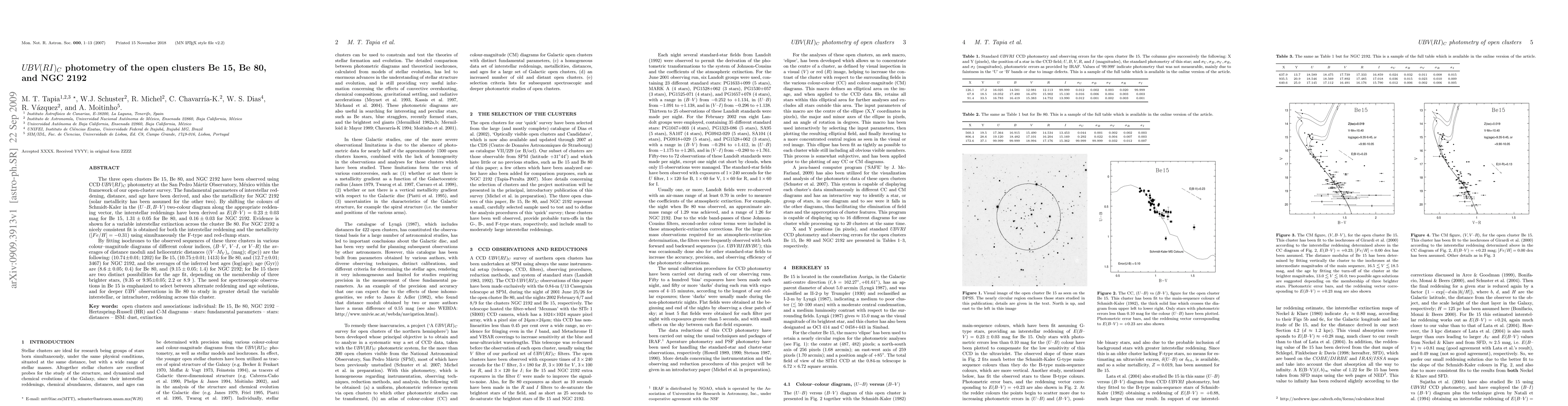 The three open clusters Be 15, Be 80, and NGC 2192 have been observed using CCD UBV(RI)_C photometry at the San Pedro M\'artir Observatory, M\'exico within the framework of our open-cluster survey. The fundamental parameters of interstellar reddening, distance, and age have been derived, and also the metallicity for NGC 2192 (solar metallicity has been assumed for the other two). By shifting the colours of Schmidt-Kaler in the (U-B, B-V) two-colour diagram along the appropriate reddening vector, the interstellar reddenings have been derived as E(B-V)=0.23+/-0.03 mag for Be 15, 1.31+/-0.05 for Be 80, and 0.16+/-0.03 for NGC 2192. Evidence is shown for a variable interstellar extinction across the cluster Be 80. For NGC 2192 a nicely consistent fit is obtained for both the interstellar reddening and the metallicity ([Fe/H]=-0.31) using simultaneously the F-type and red-clump stars. By fitting isochrones to the observed sequences of these three clusters in various colour-magnitude diagrams of different colour indices, (B-V, V-I, or V-R) the averages of distance moduli and heliocentric distances ((V-M_V)_o (mag); d(pc)) are the following: (10.74+/-0.01; 1202) for Be 15, (10.75+/-0.01; 1413) for Be 80, and (12.7+/-0.01; 3467) for NGC 2192, and the averages of the inferred best ages (log(age); age (Gyr)) are (8.6+/-0.05; 0.4) for Be 80, and (9.15+/-0.05; 1.4) for NGC 2192; for Be 15 there are two distinct possibilities for the age fit, depending on the membership of three brighter stars, (9.35 or 9.95+/-0.05; 2.2 or 8.9). The need for spectroscopic observations in Be 15 is emphasized to select between alternate reddening and age solutions, and for deeper UBV observations in Be 80 to study in greater detail the variable interstellar, or intracluster, reddening across this cluster.