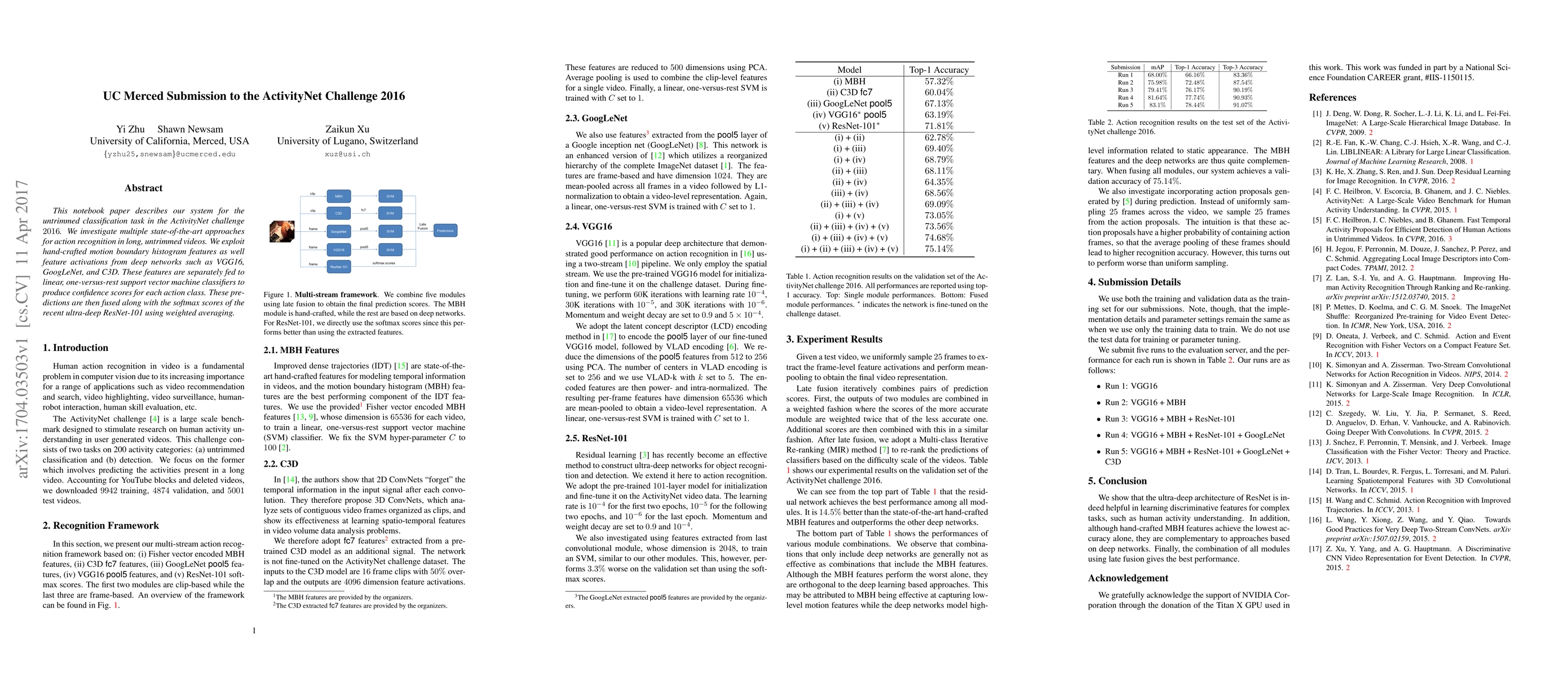 This notebook paper describes our system for the untrimmed classification task in the ActivityNet challenge 2016. We investigate multiple state-of-the-art approaches for action recognition in long, untrimmed videos. We exploit hand-crafted motion boundary histogram features as well feature activations from deep networks such as VGG16, GoogLeNet, and C3D. These features are separately fed to linear, one-versus-rest support vector machine classifiers to produce confidence scores for each action class. These predictions are then fused along with the softmax scores of the recent ultra-deep ResNet-101 using weighted averaging.