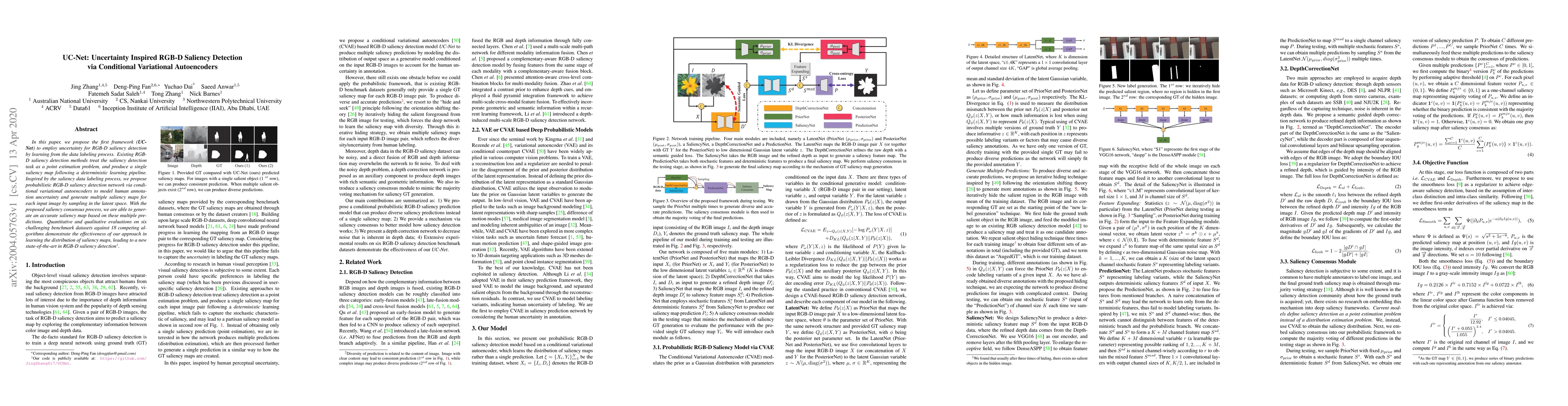 UC-Net introduces a probabilistic framework for RGB-D saliency detection using conditional variational autoencoders to model uncertainty and generate multiple saliency maps, achieving state-of-the-art performance on benchmark datasets.
