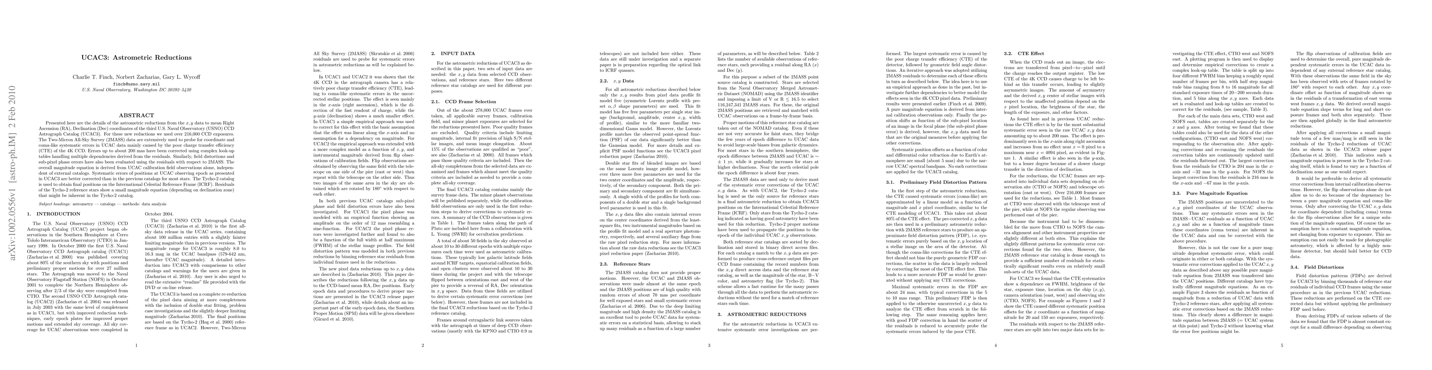 Presented here are the details of the astrometric reductions from the x,y data to mean Right Ascension (RA), Declination (Dec) coordinates of the third U.S. Naval Observatory (USNO) CCD Astrograph Catalog (UCAC3). For these new reductions we used over 216,000 CCD exposures. The Two-Micron All-Sky Survey (2MASS) data are extensively used to probe for coordinate and coma-like systematic errors in UCAC data mainly caused by the poor charge transfer efficiency (CTE) of the 4K CCD. Errors up to about 200 mas have been corrected using complex look-up tables handling multiple dependencies derived from the residuals. Similarly, field distortions and sub-pixel phase errors have also been evaluated using the residuals with respect to 2MASS. The overall magnitude equation is derived from UCAC calibration field observations alone, independent of external catalogs. Systematic errors of positions at UCAC observing epoch as presented in UCAC3 are better corrected than in the previous catalogs for most stars. The Tycho-2 catalog is used to obtain final positions on the International Celestial Reference Frame (ICRF). Residuals of the Tycho-2 reference stars show a small magnitude equation (depending on declination zone) that might be inherent in the Tycho-2 catalog.