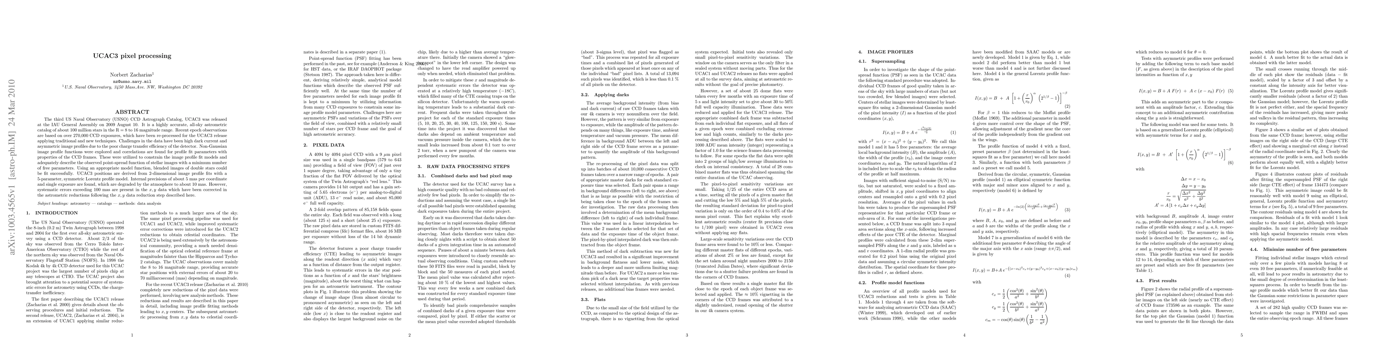 The third US Naval Observatory (USNO) CCD Astrograph Catalog, UCAC3 was released at the IAU General Assembly on 2009 August 10. It is a highly accurate, all-sky astrometric catalog of about 100 million stars in the R = 8 to 16 magnitude range. Recent epoch observations are based on over 270,000 CCD exposures, which have been re-processed for the UCAC3 release applying traditional and new techniques. Challenges in the data have been high dark current and asymmetric image profiles due to the poor charge transfer efficiency of the detector. Non-Gaussian image profile functions were explored and correlations are found for profile fit parameters with properties of the CCD frames. These were utilized to constrain the image profile fit models and adequately describe the observed point-spread function of stellar images with a minimum number of free parameters. Using an appropriate model function, blended images of double stars could be fit successfully. UCAC3 positions are derived from 2-dimensional image profile fits with a 5-parameter, symmetric Lorentz profile model. Internal precisions of about 5 mas per coordinate and single exposure are found, which are degraded by the atmosphere to about 10 mas. However, systematic errors exceeding 100 mas are present in the x,y-data which have been corrected in the astrometric reductions following the x,y-data reduction step described here.