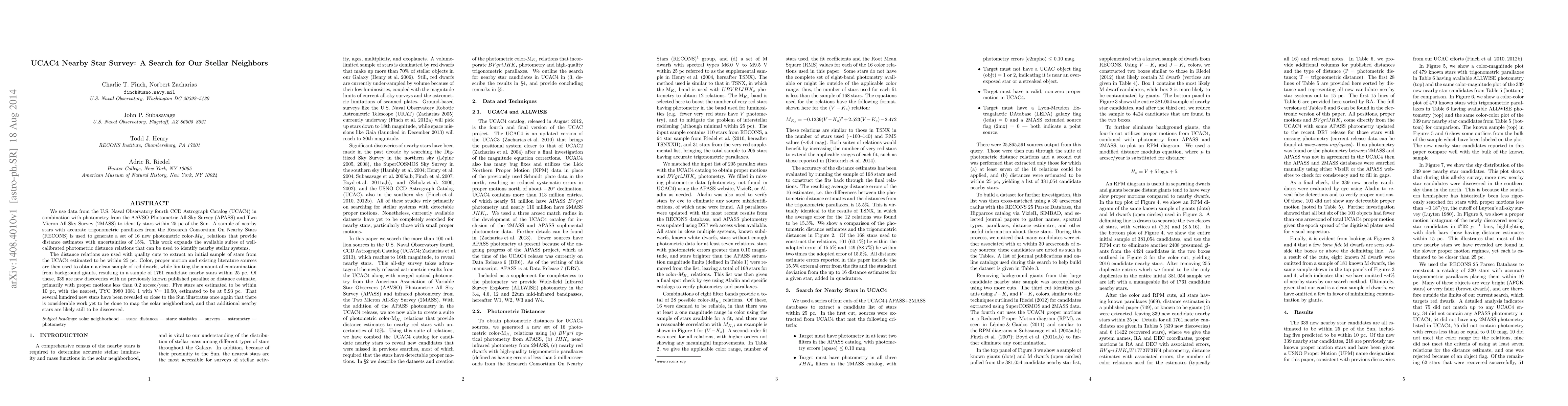 We use data from the U.S. Naval Observatory fourth CCD Astrograph Catalog (UCAC4) in combination with photometry from the AAVSO Photometric All-Sky Survey (APASS) and Two Micron All-Sky Survey (2MASS) to identify stars within 25 pc of the Sun. A sample of nearby stars with accurate trigonometric parallaxes from the Research Consortium On Nearby Stars (RECONS) is used to generate a set of 16 new photometric color-$M_{K{_s}}$ relations that provide distance estimates with uncertainties of 15\%. This work expands the available suites of well-calibrated photometric distance relations that can be used to identify nearby stellar systems. The distance relations are used with quality cuts to extract an initial sample of stars from the UCAC4 estimated to be within 25 pc. Color, proper motion and existing literature sources are then used to obtain a clean sample of red dwarfs, while limiting the amount of contamination from background giants, resulting in a sample of 1761 candidate nearby stars within 25 pc. Of these, 339 are new discoveries with no previously known published parallax or distance estimate, primarily with proper motions less than 0.2 arcsec/year. Five stars are estimated to be within 10 pc, with the nearest, TYC 3980 1081 1 with V$=$ 10.50, estimated to be at 5.93 pc. That several hundred new stars have been revealed so close to the Sun illustrates once again that there is considerable work yet to be done to map the solar neighborhood, and that additional nearby stars are likely still to be discovered.