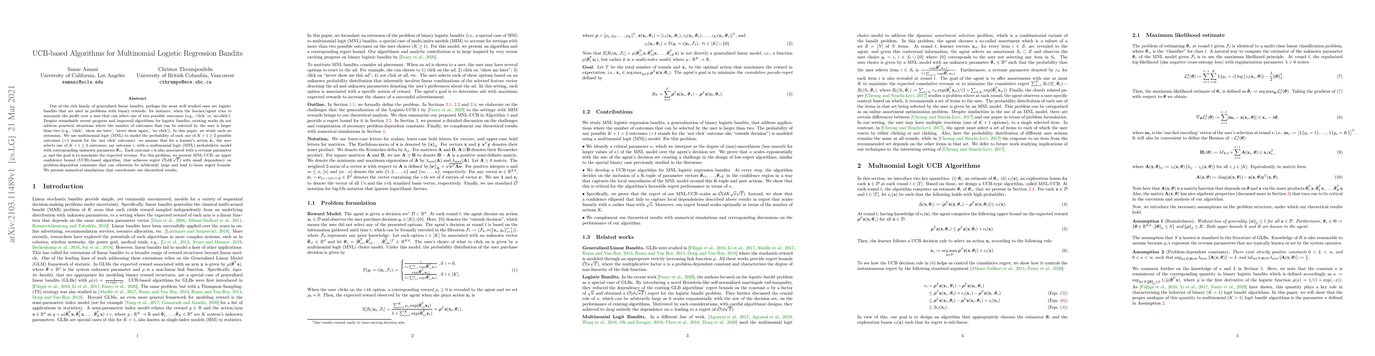 This paper introduces MNL-UCB, a UCB-based algorithm for multinomial logistic regression bandits, addressing scenarios with more than two possible outcomes. It aims to maximize expected revenue by modeling the probability of each outcome using a multinomial logit model, achieving a regret bound of $\tilde{\mathcal{O}}(dK\sqrt{T})$ and corroborated by numerical simulations.