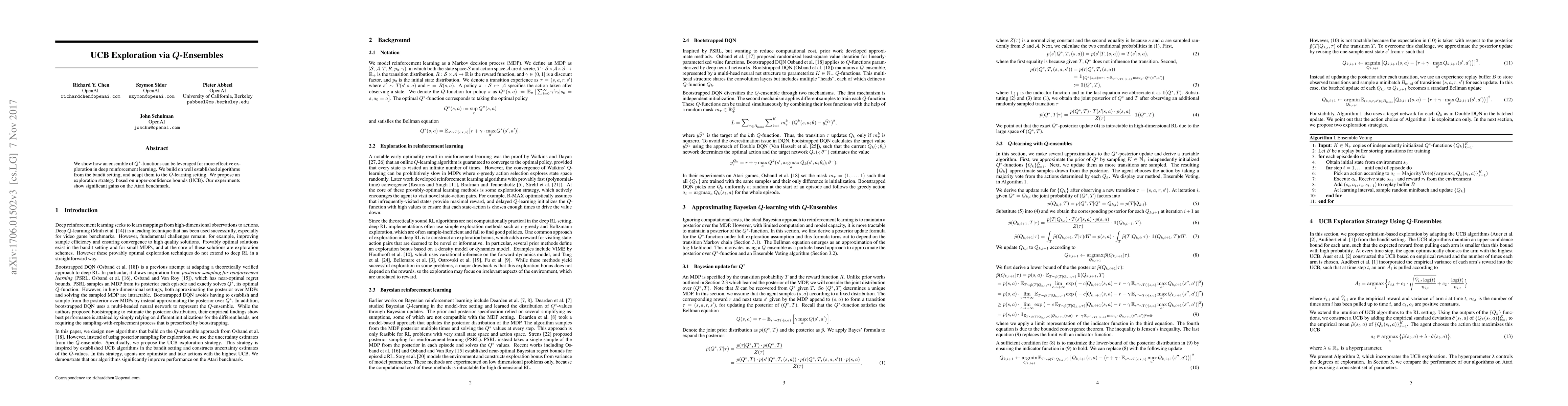 We show how an ensemble of $Q^*$-functions can be leveraged for more effective exploration in deep reinforcement learning. We build on well established algorithms from the bandit setting, and adapt them to the $Q$-learning setting. We propose an exploration strategy based on upper-confidence bounds (UCB). Our experiments show significant gains on the Atari benchmark.