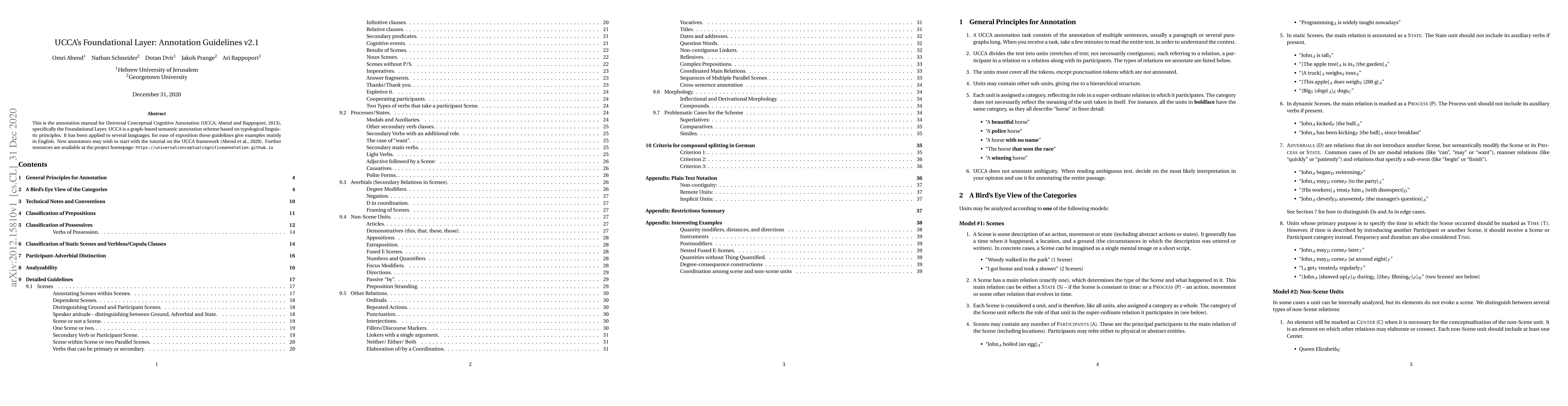 This is the annotation manual for Universal Conceptual Cognitive Annotation (UCCA; Abend and Rappoport, 2013), specifically the Foundational Layer. UCCA is a graph-based semantic annotation scheme based on typological linguistic principles. It has been applied to several languages; for ease of exposition these guidelines give examples mainly in English. New annotators may wish to start with the tutorial on the UCCA framework (Abend et al., 2020). Further resources are available at the project homepage: https://universalconceptualcognitiveannotation.github.io