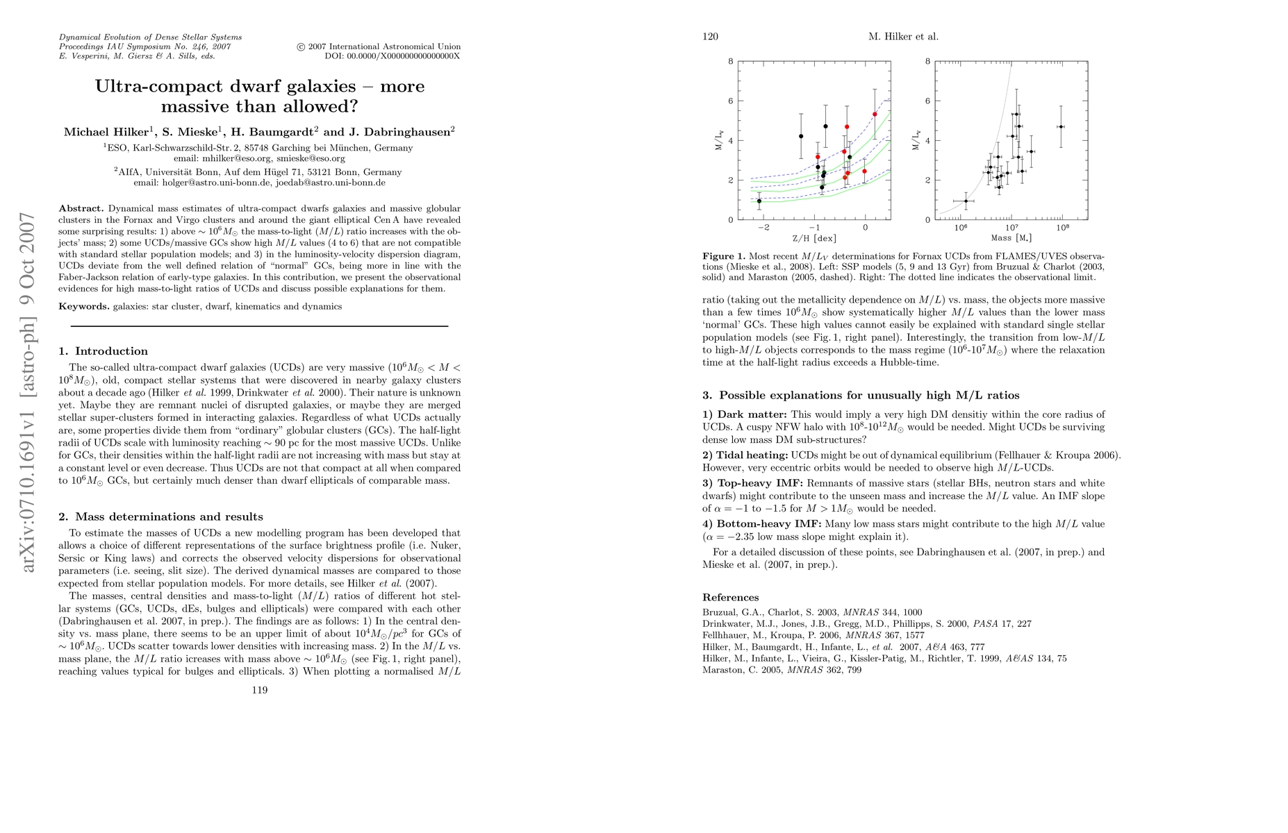 This paper reports on dynamical mass estimates revealing that ultra-compact dwarf galaxies (UCDs) and massive globular clusters (GCs) possess unexpectedly high mass-to-light ratios, challenging standard stellar population models and suggesting they may be more massive than previously thought. Possible explanations for these findings are discussed.