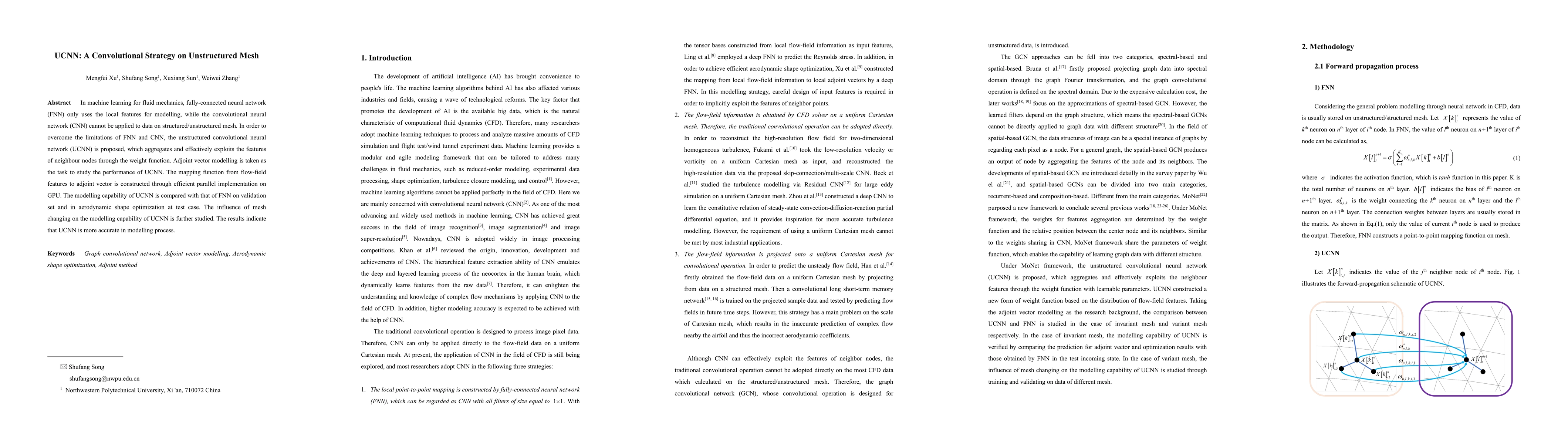 In machine learning for fluid mechanics, fully-connected neural network (FNN) only uses the local features for modelling, while the convolutional neural network (CNN) cannot be applied to data on structured/unstructured mesh. In order to overcome the limitations of FNN and CNN, the unstructured convolutional neural network (UCNN) is proposed, which aggregates and effectively exploits the features of neighbour nodes through the weight function. Adjoint vector modelling is taken as the task to study the performance of UCNN. The mapping function from flow-field features to adjoint vector is constructed through efficient parallel implementation on GPU. The modelling capability of UCNN is compared with that of FNN on validation set and in aerodynamic shape optimization at test case. The influence of mesh changing on the modelling capability of UCNN is further studied. The results indicate that UCNN is more accurate in modelling process.