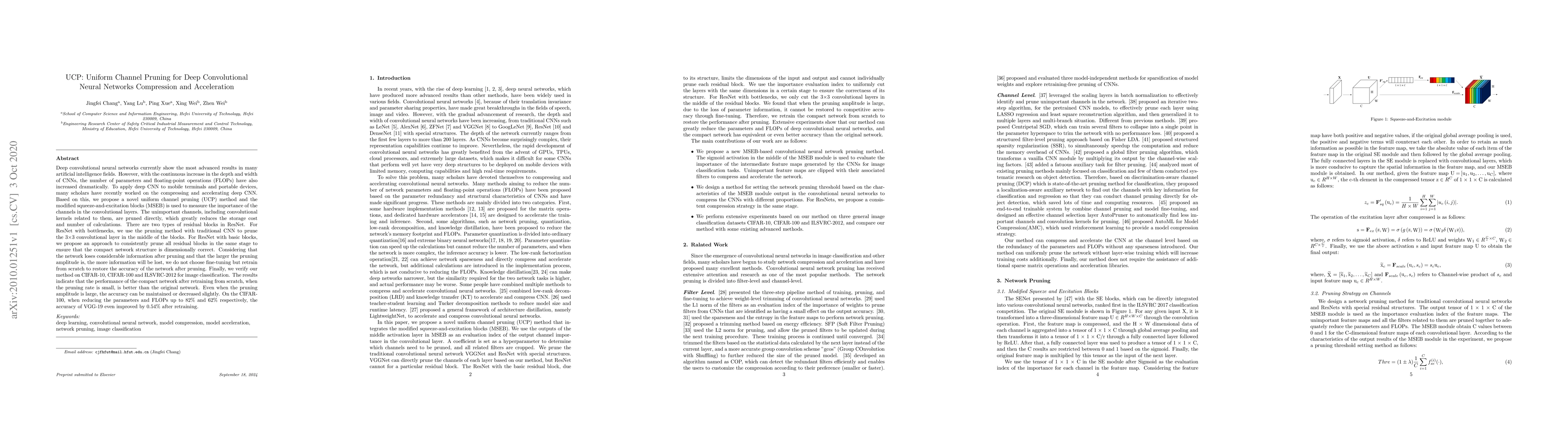 The paper proposes a Uniform Channel Pruning (UCP) method to compress and accelerate deep convolutional neural networks for mobile devices. It employs modified squeeze-and-excitation blocks to identify and prune unimportant channels, reducing storage and computational costs while maintaining or slightly decreasing accuracy through retraining from scratch.