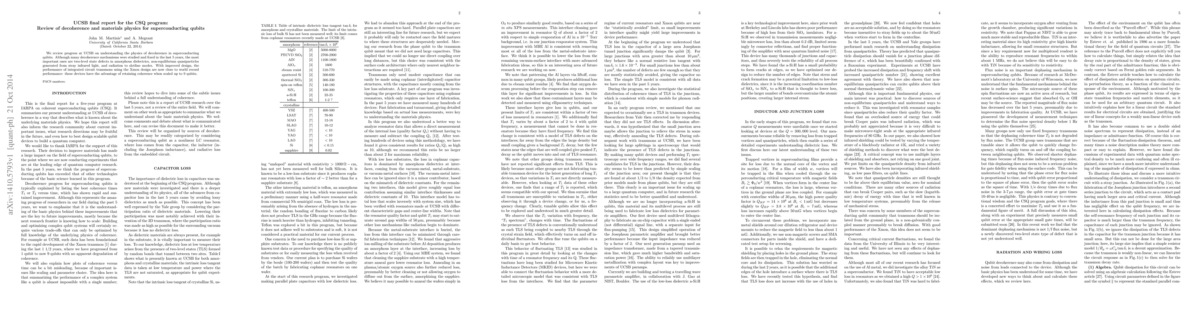 We review progress at UCSB on understanding the physics of decoherence in superconducting qubits. Although many decoherence mechanisms were studied and fixed in the last 5 years, the most important ones are two-level state defects in amorphous dielectrics, non-equilibrium quasiparticles generated from stray infrared light, and radiation to slotline modes. With improved design, the performance of integrated circuit transmons using the Xmon design are now close to world record performance: these devices have the advantage of retaining coherence when scaled up to 9 qubits.