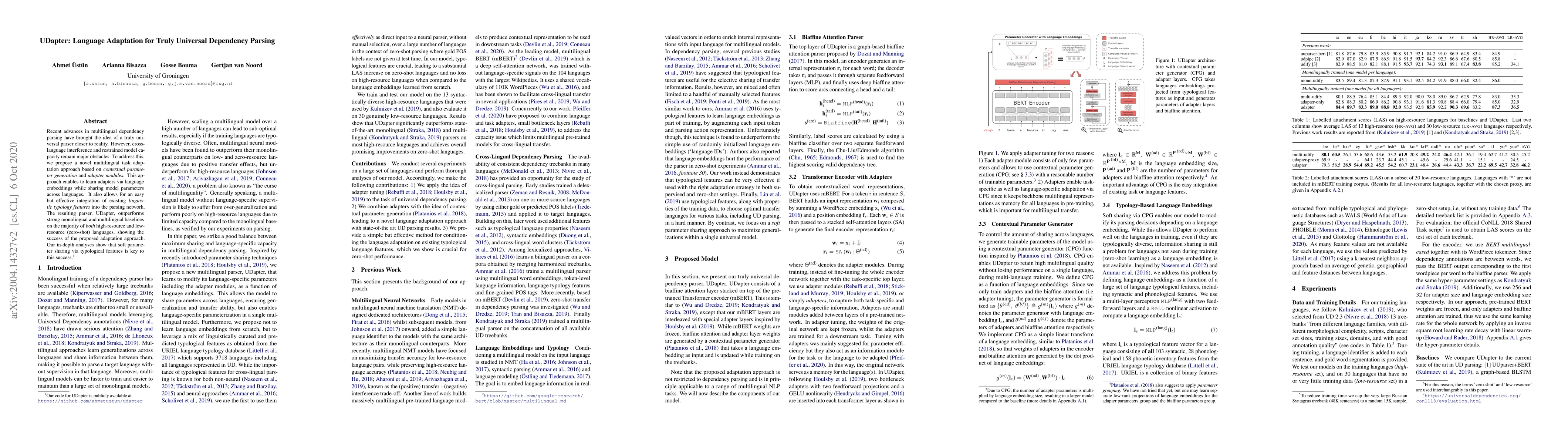 UDapter introduces a novel multilingual adaptation method for universal dependency parsing, utilizing contextual parameter generation and adapter modules to overcome cross-language interference. The approach achieves superior performance across various languages, demonstrating the effectiveness of soft parameter sharing through typological features.