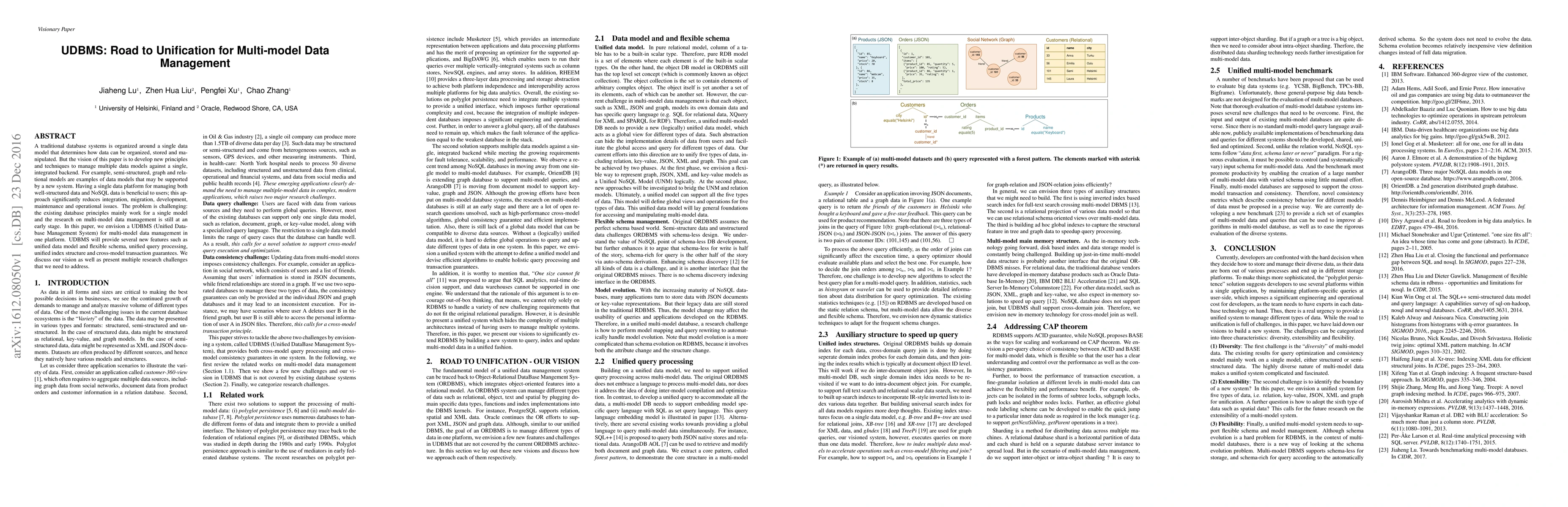This paper proposes a Unified Database Management System (UDBMS) to manage multiple data models—such as semi-structured, graph, and relational—within a single integrated backend. The UDBMS aims to reduce integration and operational challenges by providing unified data models, query processing, and cross-model transaction guarantees.