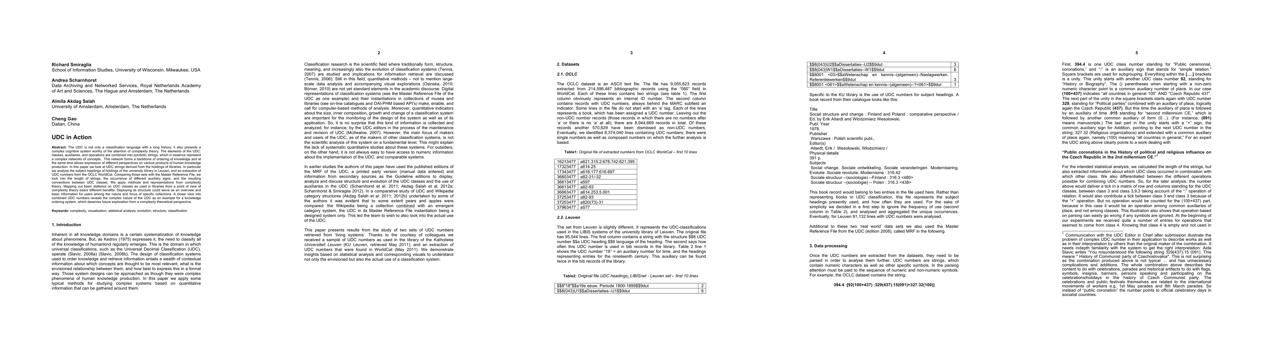 The UDC (Universal Decimal Classification) is not only a classification language with a long history; it also presents a complex cognitive system worthy of the attention of complexity theory. The elements of the UDC: classes, auxiliaries, and operations are combined into symbolic strings, which in essence represent a complex networks of concepts. This network forms a backbone of ordering of knowledge and at the same time allows expression of different perspectives on various products of human knowledge production. In this paper we look at UDC strings derived from the holdings of libraries. In particular we analyse the subject headings of holdings of the university library in Leuven, and an extraction of UDC numbers from the OCLC WorldCat. Comparing those sets with the Master Reference File, we look into the length of strings, the occurrence of different auxiliary signs, and the resulting connections between UDC classes. We apply methods and representations from complexity theory. Mapping out basic statistics on UDC classes as used in libraries from a point of view of complexity theory bears different benefits. Deploying its structure could serve as an overview and basic information for users among the nature and focus of specific collections. A closer view into combined UDC numbers reveals the complex nature of the UDC as an example for a knowledge ordering system, which deserves future exploration from a complexity theoretical perspective.