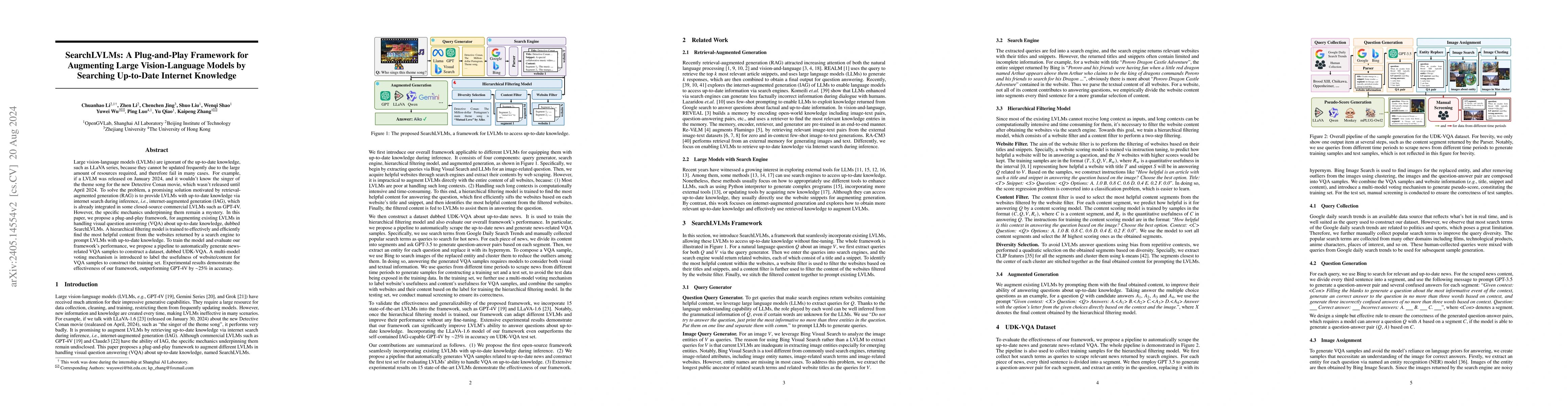 Large vision-language models (LVLMs) are ignorant of the up-to-date knowledge, such as LLaVA series, because they cannot be updated frequently due to the large amount of resources required, and therefore fail in many cases. For example, if a LVLM was released on January 2024, and it wouldn't know the detailed plot of the new movie Dune 2, which wasn't released until February 2024. To solve the problem, a promising solution is to provide LVLMs with up-to-date knowledge via internet search during inference, i.e., internet-augmented generation (IAG), which is already integrated in some closed-source commercial LVLMs such as GPT-4V. However, the specific mechanics underpinning them remain a mystery. In this paper, we propose a plug-and-play framework, for augmenting existing LVLMs in handling visual question answering (VQA) about up-to-date knowledge, dubbed UDKAG. A hierarchical filtering model is trained to effectively and efficiently find the most helpful content from the websites returned by a search engine to prompt LVLMs with up-to-date knowledge. To train the model and evaluate our framework's performance, we propose a pipeline to automatically generate news-related VQA samples to construct a dataset, dubbed UDK-VQA. A multi-model voting mechanism is introduced to label the usefulness of website/content for VQA samples to construct the training set. Experimental results demonstrate the effectiveness of our framework, outperforming GPT-4V by about 25% in accuracy.