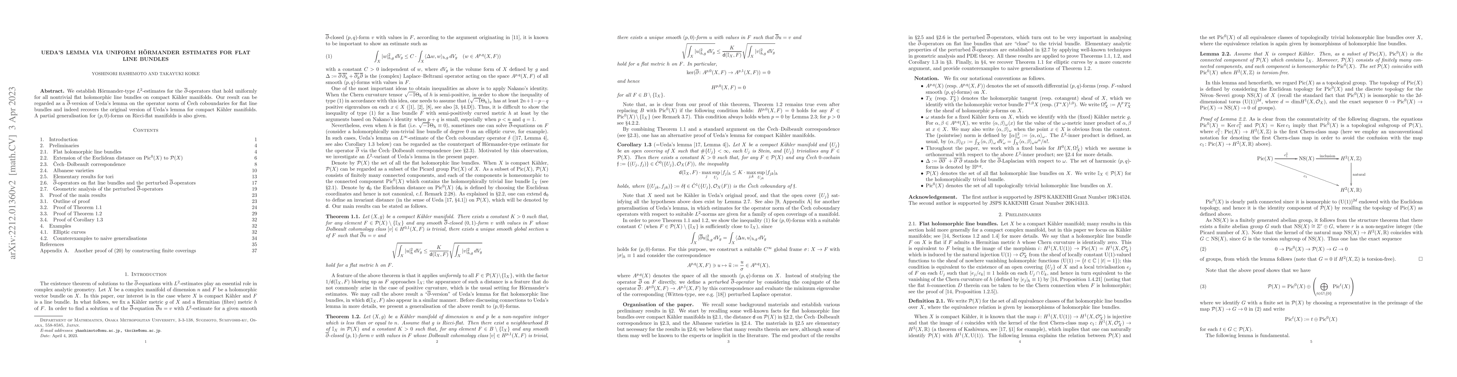 We establish H\"ormander-type $L^2$-estimates for the $\overline{\partial}$-operators that hold uniformly for all nontrivial flat holomorphic line bundles on compact K\"ahler manifolds. Our result can be regarded as a $\overline{\partial}$-version of Ueda's lemma on the operator norm of \v{C}ech coboundaries for flat line bundles and indeed recovers the original version of Ueda's lemma for compact K\"ahler manifolds. A partial generalisation for $(p,0)$-forms on Ricci-flat manifolds is also given.