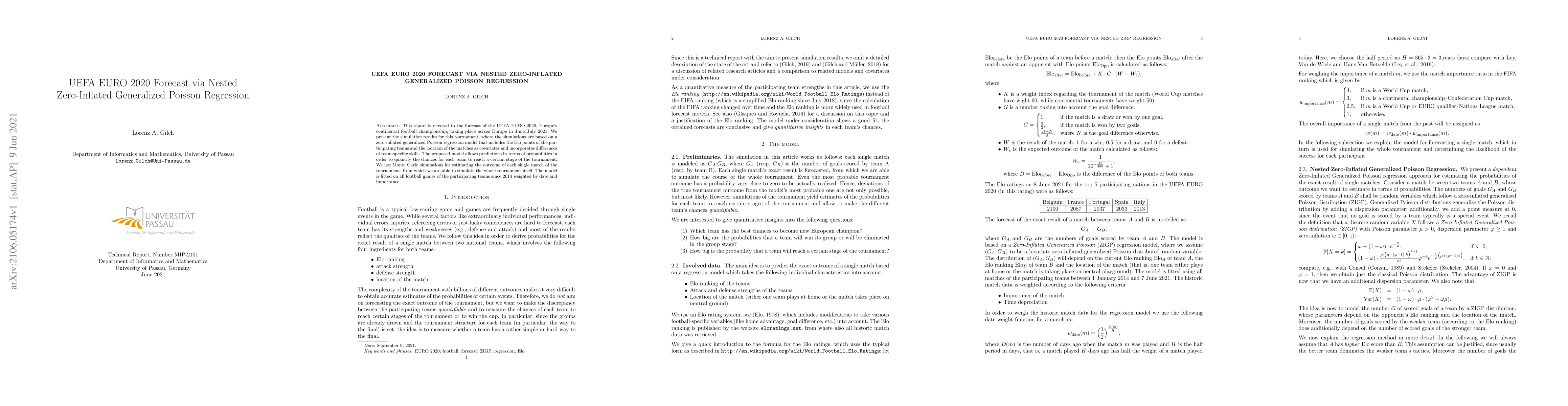 This report is devoted to the forecast of the UEFA EURO 2020, Europe's continental football championship, taking place across Europe in June/July 2021. We present the simulation results for this tournament, where the simulations are based on a zero-inflated generalized Poisson regression model that includes the Elo points of the participating teams and the location of the matches as covariates and incorporates differences of team-specific skills. The proposed model allows predictions in terms of probabilities in order to quantify the chances for each team to reach a certain stage of the tournament. We use Monte Carlo simulations for estimating the outcome of each single match of the tournament, from which we are able to simulate the whole tournament itself. The model is fitted on all football games of the participating teams since 2014 weighted by date and importance.