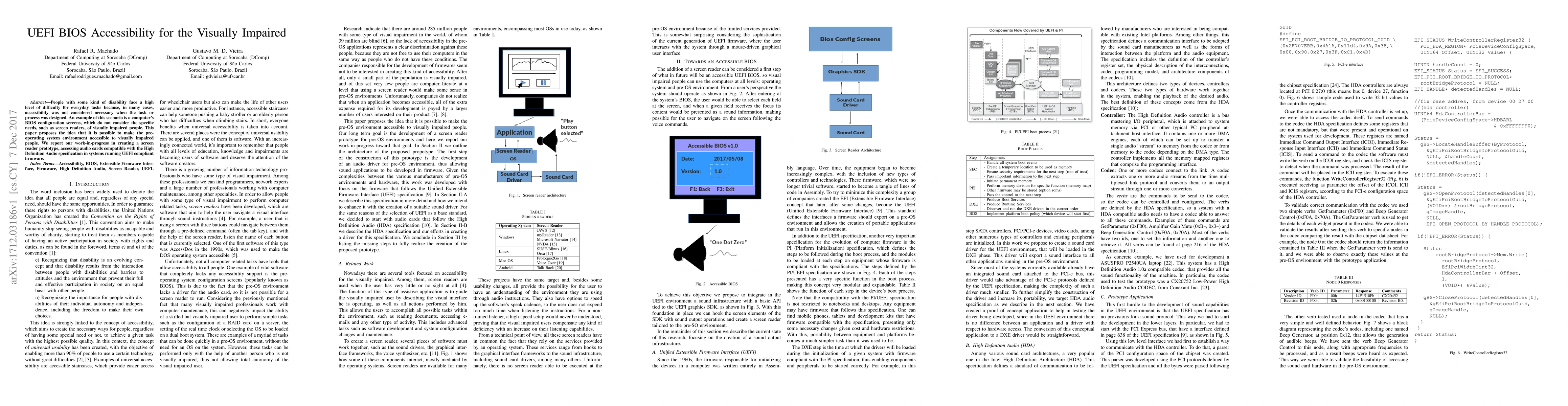 This paper explores making UEFI BIOS configuration screens accessible to visually impaired individuals by developing a screen reader prototype that utilizes compatible audio cards, aiming to integrate necessary accessibility features into the pre-operating system environment.