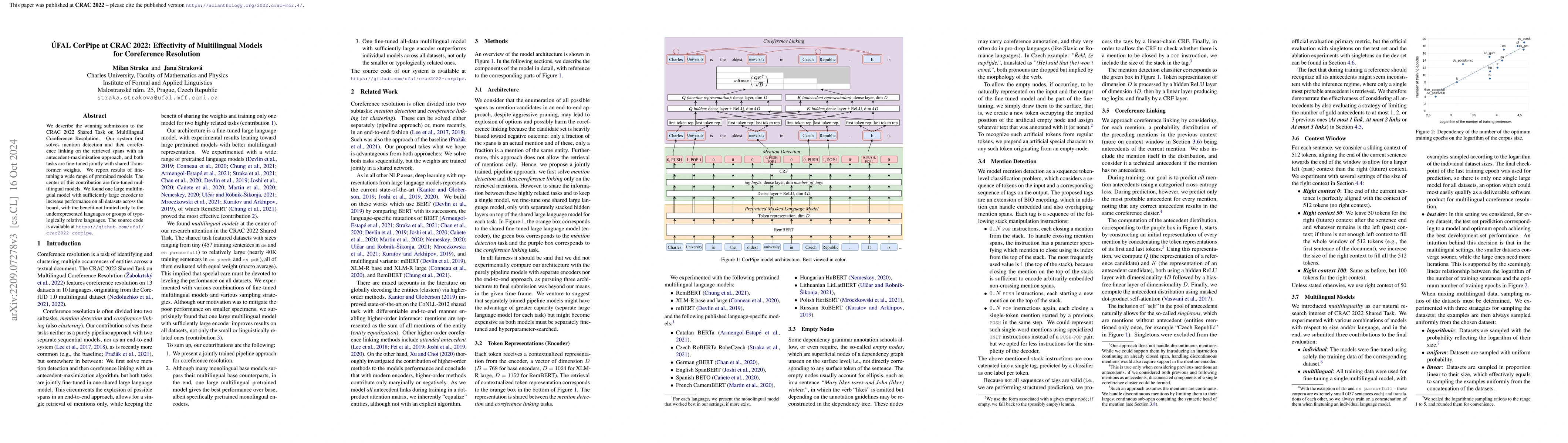 We describe the winning submission to the CRAC 2022 Shared Task on Multilingual Coreference Resolution. Our system first solves mention detection and then coreference linking on the retrieved spans with an antecedent-maximization approach, and both tasks are fine-tuned jointly with shared Transformer weights. We report results of fine-tuning a wide range of pretrained models. The center of this contribution are fine-tuned multilingual models. We found one large multilingual model with sufficiently large encoder to increase performance on all datasets across the board, with the benefit not limited only to the underrepresented languages or groups of typologically relative languages. The source code is available at https://github.com/ufal/crac2022-corpipe.