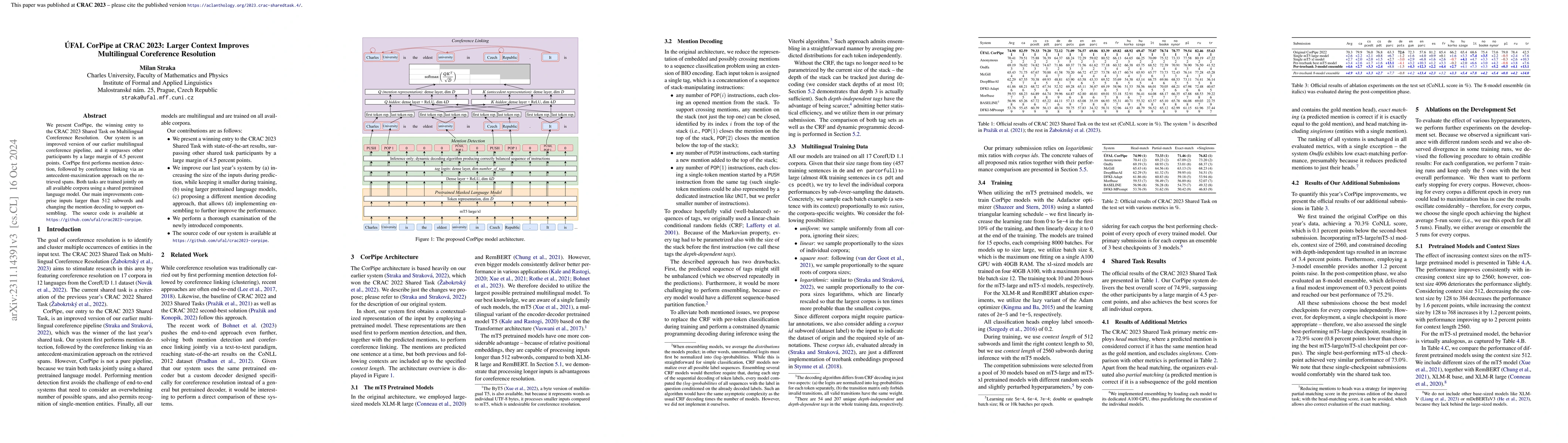 We present CorPipe, the winning entry to the CRAC 2023 Shared Task on Multilingual Coreference Resolution. Our system is an improved version of our earlier multilingual coreference pipeline, and it surpasses other participants by a large margin of 4.5 percent points. CorPipe first performs mention detection, followed by coreference linking via an antecedent-maximization approach on the retrieved spans. Both tasks are trained jointly on all available corpora using a shared pretrained language model. Our main improvements comprise inputs larger than 512 subwords and changing the mention decoding to support ensembling. The source code is available at https://github.com/ufal/crac2023-corpipe.