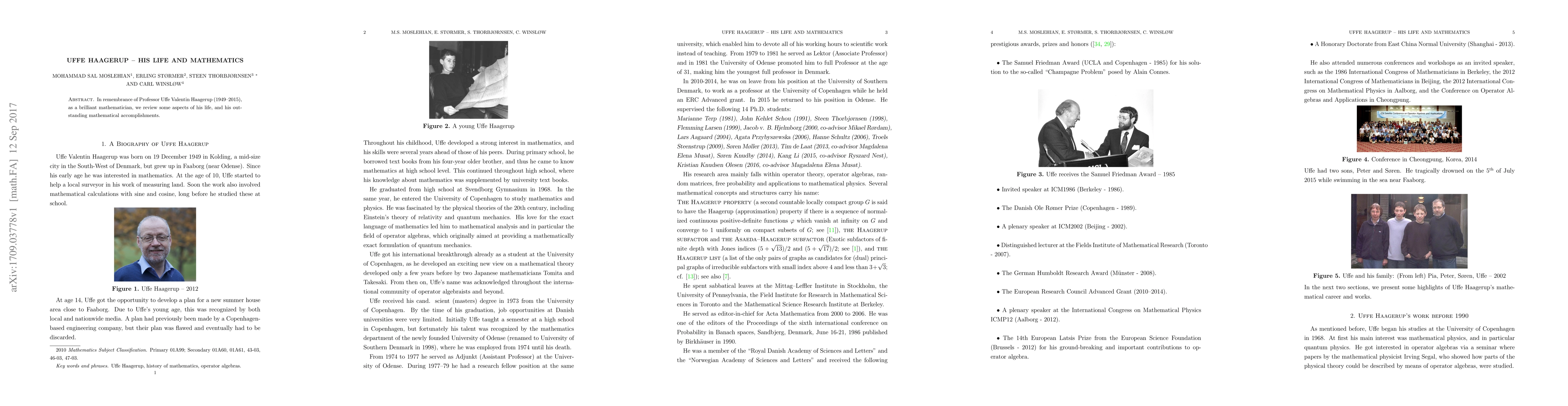 In remembrance of Professor Uffe Valentin Haagerup (1949--2015), as a brilliant mathematician, we review some aspects of his life, and his outstanding mathematical accomplishments.