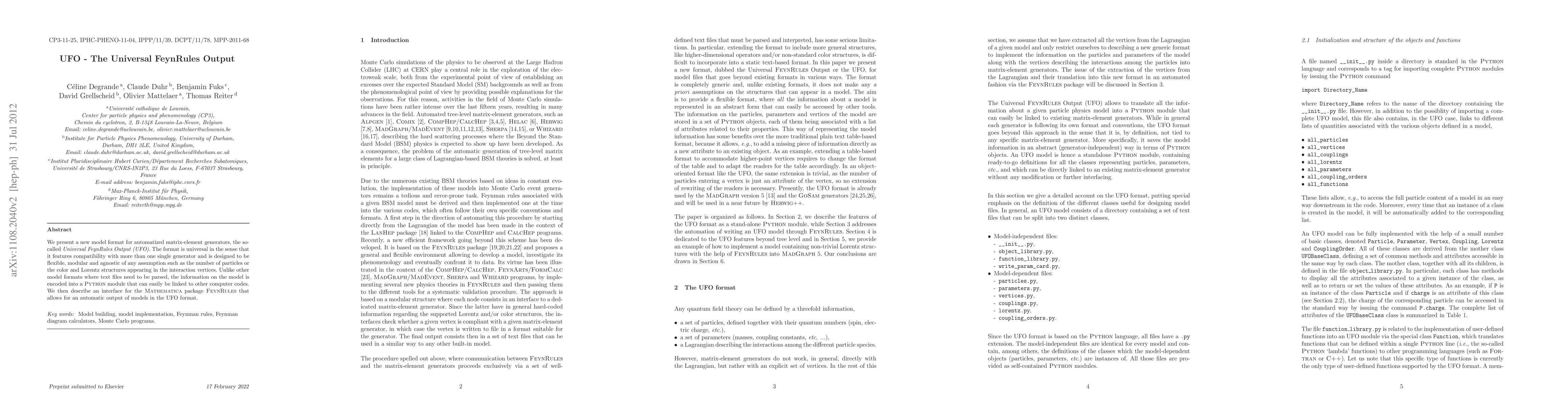 The paper introduces the Universal FeynRules Output (UFO) format, a flexible, modular model format for automated matrix-element generators that supports multiple generators and encodes model information in a Python module for easy integration. An interface for the Mathematica package FeynRules is also presented to automatically output models in the UFO format.