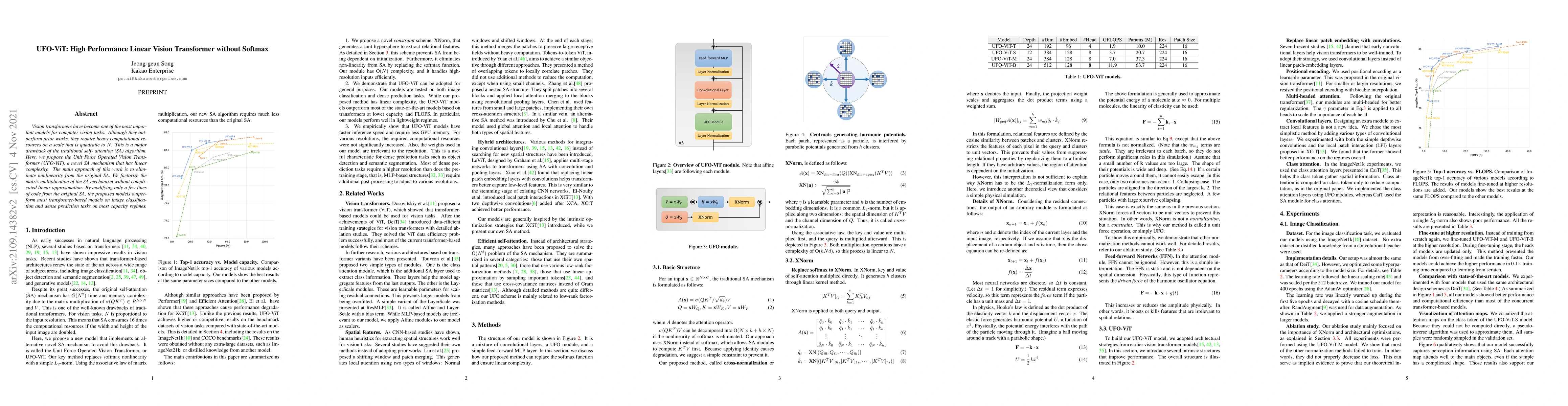 The UFO-ViT introduces a novel linear self-attention mechanism for vision transformers, achieving linear complexity instead of the traditional quadratic complexity. This modification, achieved by eliminating nonlinearity and factorizing matrix multiplication, enhances performance on image classification and dense prediction tasks.