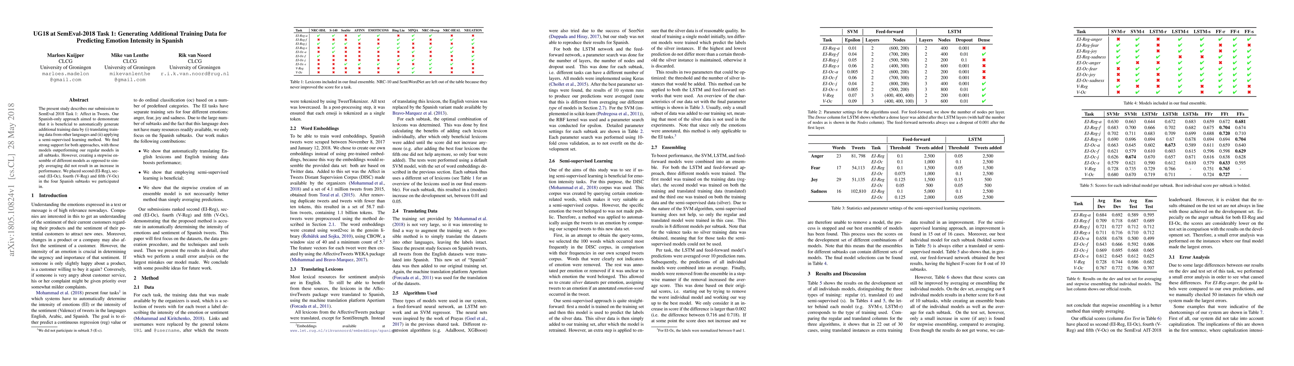 The present study describes our submission to SemEval 2018 Task 1: Affect in Tweets. Our Spanish-only approach aimed to demonstrate that it is beneficial to automatically generate additional training data by (i) translating training data from other languages and (ii) applying a semi-supervised learning method. We find strong support for both approaches, with those models outperforming our regular models in all subtasks. However, creating a stepwise ensemble of different models as opposed to simply averaging did not result in an increase in performance. We placed second (EI-Reg), second (EI-Oc), fourth (V-Reg) and fifth (V-Oc) in the four Spanish subtasks we participated in.