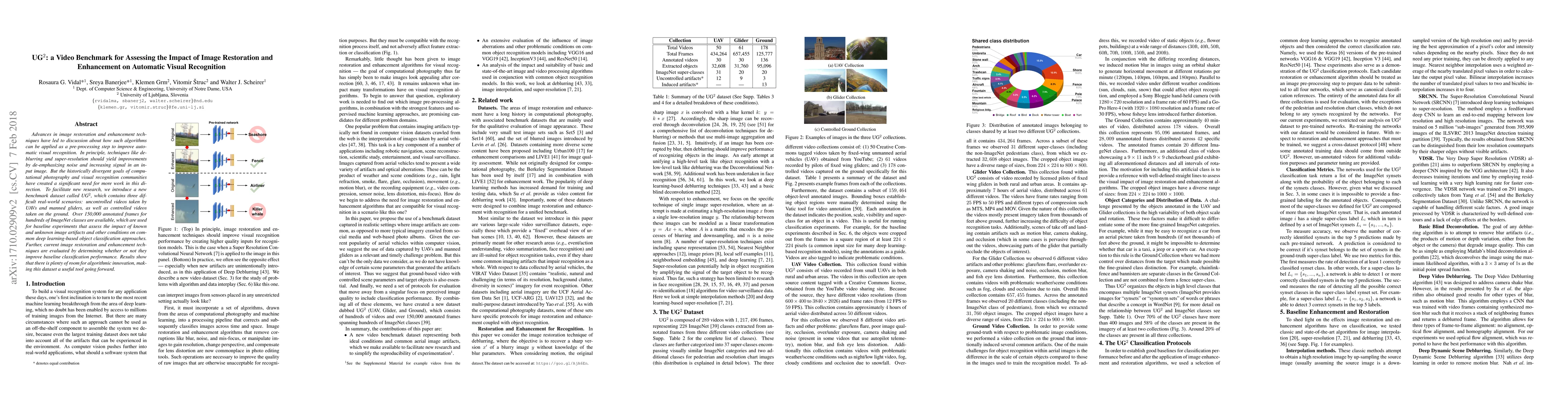 Advances in image restoration and enhancement techniques have led to discussion about how such algorithmscan be applied as a pre-processing step to improve automatic visual recognition. In principle, techniques like deblurring and super-resolution should yield improvements by de-emphasizing noise and increasing signal in an input image. But the historically divergent goals of the computational photography and visual recognition communities have created a significant need for more work in this direction. To facilitate new research, we introduce a new benchmark dataset called UG^2, which contains three difficult real-world scenarios: uncontrolled videos taken by UAVs and manned gliders, as well as controlled videos taken on the ground. Over 160,000 annotated frames forhundreds of ImageNet classes are available, which are used for baseline experiments that assess the impact of known and unknown image artifacts and other conditions on common deep learning-based object classification approaches. Further, current image restoration and enhancement techniques are evaluated by determining whether or not theyimprove baseline classification performance. Results showthat there is plenty of room for algorithmic innovation, making this dataset a useful tool going forward.