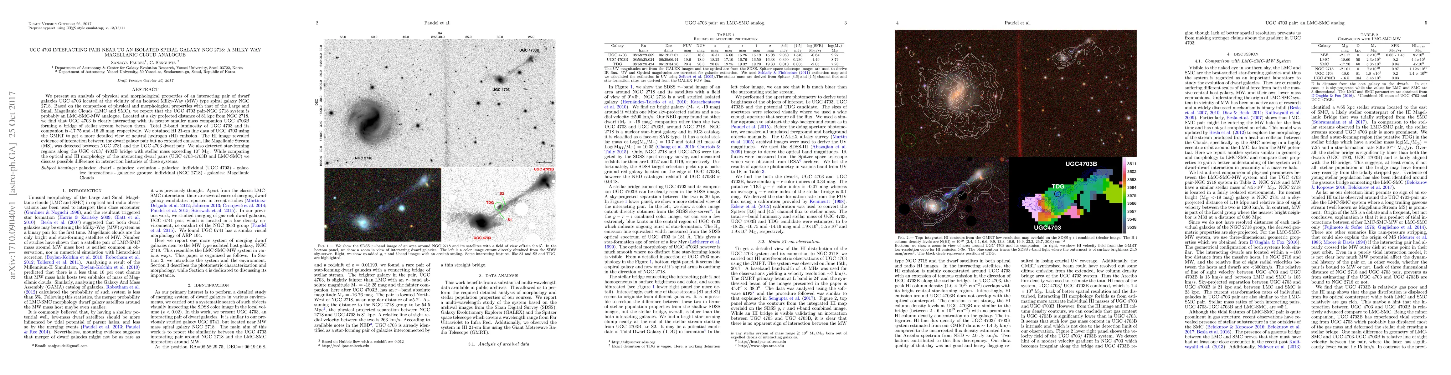 We present an analysis of physical and morphological properties of an interacting pair of dwarf galaxies UGC 4703 located at the vicinity of an isolated Milky-Way (MW) type spiral galaxy NGC 2718. Based on the comparison of physical and morphological properties with that of the Large and Small Magellanic Clouds (LMC and SMC), we report that the UGC 4703 pair-NGC 2718 system is probably an LMC-SMC-MW analogue. Located at a sky projected distance of 81 kpc from NGC 2718, we find that UGC 4703 is clearly interacting with its nearby smaller mass companion UGC 4703B forming a bridge of stellar stream between them. Total B-band luminosity of UGC 4703 and its companion is -17.75 and -16.25 mag, respectively. We obtained HI 21-cm line data of UGC 4703 using the GMRT to get a more detailed view of neutral hydrogen (HI) emission. The HI image revealed evidence of interaction between the dwarf galaxy pair but no extended emission, like Magellanic Stream (MS), was detected between NGC 2781 and the UGC 4703 dwarf pair. We also detected star-forming regions along the UGC 4703/ 4703B bridge with stellar mass exceeding 10$^{7}$ M$_{\odot}$. While comparing the optical and HI morphology of the interacting dwarf pairs (UGC 4703-4703B and LMC-SMC) we discuss possible difference in interaction histories of these systems.