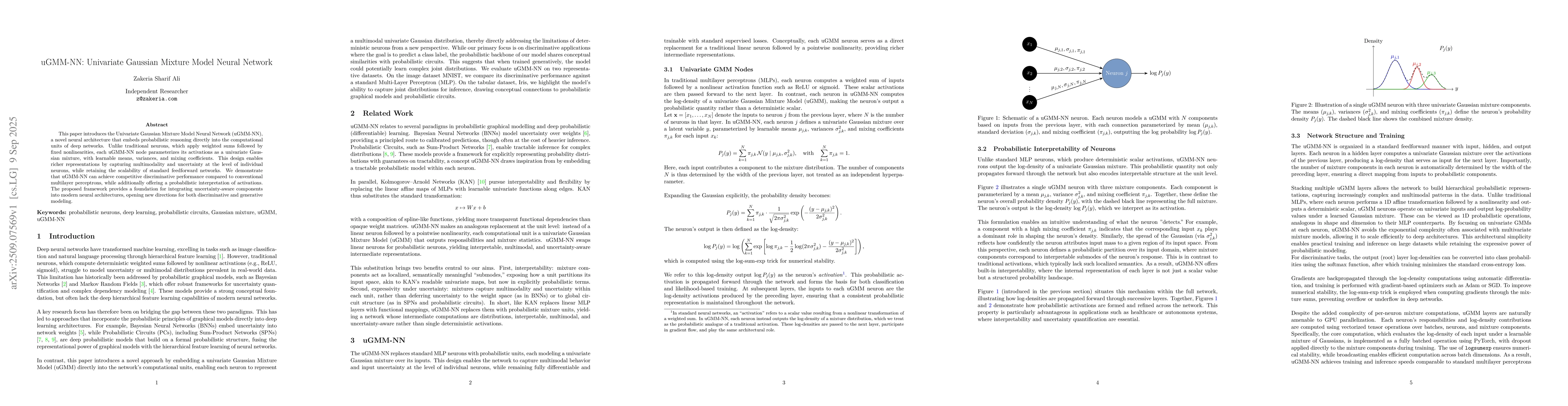 This paper introduces the Univariate Gaussian Mixture Model Neural Network (uGMM-NN), a novel neural architecture that embeds probabilistic reasoning directly into the computational units of deep networks. Unlike traditional neurons, which apply weighted sums followed by fixed nonlinearities, each uGMM-NN node parameterizes its activations as a univariate Gaussian mixture, with learnable means, variances, and mixing coefficients. This design enables richer representations by capturing multimodality and uncertainty at the level of individual neurons, while retaining the scalability of standard feedforward networks. We demonstrate that uGMM-NN can achieve competitive discriminative performance compared to conventional multilayer perceptrons, while additionally offering a probabilistic interpretation of activations. The proposed framework provides a foundation for integrating uncertainty-aware components into modern neural architectures, opening new directions for both discriminative and generative modeling.