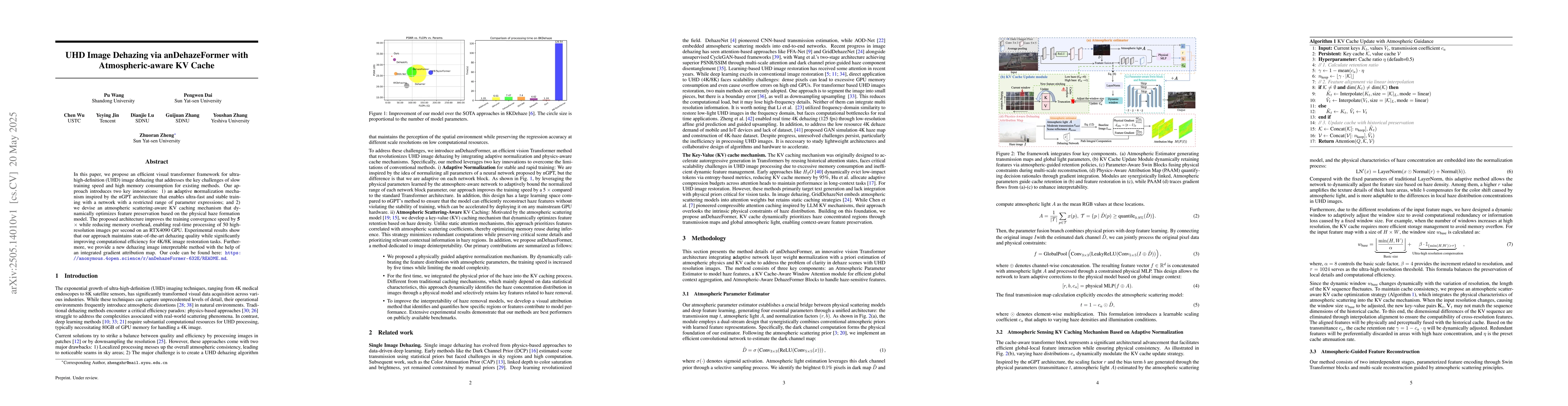 The paper proposes an efficient visual transformer framework for UHD image dehazing, incorporating adaptive normalization inspired by nGPT and an atmospheric scattering-aware KV caching mechanism.