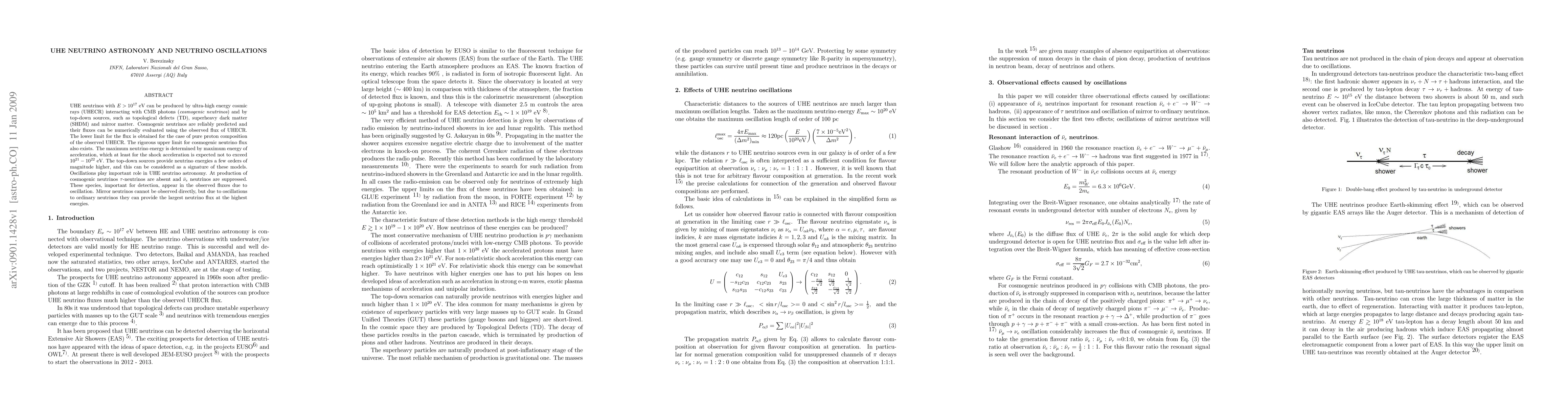 UHE neutrinos with $E>10^{17}$ eV can be produced by ultra-high energy cosmic rays (UHECR) interacting with CMB photons (cosmogenic neutrinos) and by top-down sources, such as topological defects (TD), superheavy dark matter (SHDM) and mirror matter. Cosmogenic neutrinos are reliably predicted and their fluxes can be numerically evaluated using the observed flux of UHECR. The lower limit for the flux is obtained for the case of pure proton composition of the observed UHECR. The rigorous upper limit for cosmogenic neutrino flux also exists. The maximum neutrino energy is determined by maximum energy of acceleration, which at least for the shock acceleration is expected not to exceed $10^{21} - 10^{22}$ eV. The top-down sources provide neutrino energies a few orders of magnitude higher, and this can be considered as a signature of these models. Oscillations play important role in UHE neutrino astronomy. At production of cosmogenic neutrinos $\tau$-neutrinos are absent and $\bar{\nu}_e$ neutrinos are suppressed. These species, important for detection, appear in the observed fluxes due to oscillation. Mirror neutrinos cannot be observed directly, but due to oscillations to ordinary neutrinos they can provide the largest neutrino flux at the highest energies.