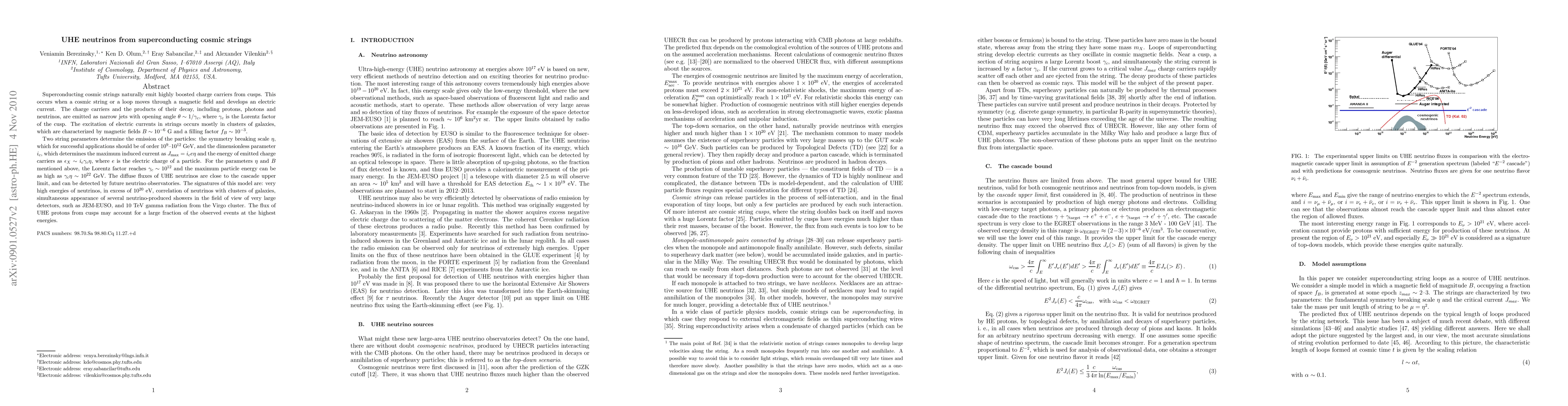Superconducting cosmic strings naturally emit highly boosted charge carriers from cusps. This occurs when a cosmic string or a loop moves through a magnetic field and develops an electric current. The charge carriers and the products of their decay, including protons, photons and neutrinos, are emitted as a narrow jets with opening angle $\theta \sim 1/\gamma_c$, where $\gamma_c$ is the Lorentz factor of the cusp. The excitation of electric currents in strings occurs mostly in clusters of galaxies, which are characterized by magnetic fields $B \sim 10^{-6}$ G and a filling factor $f_B \sim 10^{-3}$. Two string parameters determine the emission of the particles: the symmetry breaking scale $\eta$, which for successful applications should be of order $10^9$--$10^{12}$ GeV, and the dimensionless parameter $i_c$, which determines the maximum induced current as $J_{max} =i_c e \eta$ and the energy of emitted charge carriers as $\epsilon_x \sim i_c \gamma_c \eta$, where $e$ is the electric charge of a particle. For the parameters $\eta $ and $B$ mentioned above, the Lorentz factor reaches $\gamma_c \sim 10^{12}$ and the maximum particle energy can be as high as $\gamma_c\eta \sim 10^{22}$ GeV. The diffuse fluxes of UHE neutrinos are close to the cascade upper limit, and can be detected by future neutrino observatories. The signatures of this model are: very high energies of neutrinos, in excess of $10^{20}$ eV, correlation of neutrinos with clusters of galaxies, simultaneous appearance of several neutrino-produced showers in the field of view of very large detectors, such as JEM-EUSO, and 10 TeV gamma radiation from the Virgo cluster. The flux of UHE protons from cusps may account for a large fraction of the observed events at the highest energies.